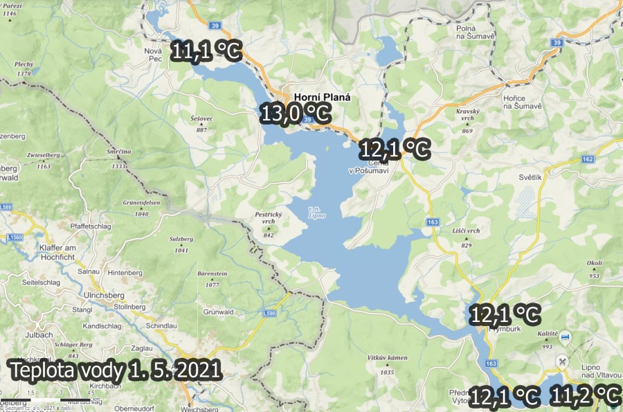 Měření bylo provedeno v prvním květnovém dni a to na každé lokalitě zhruba 2 metry od břehu v hloubce 10 cm. Výsledky jsou tak trochu překvapením, protože na všech lokalitách měla voda teplotu relativně teplou a to mezi 11 °C až 13 °C, což je rozhodně více než by se po studeném dubnu čekalo. Nejnižší teplotu měla voda Lipenské přehrady v Nové Peci, což je způsobeno přítokem chladnější vody z řeky Vltavy. Naopak nejteplejší voda byla u břehu pláže v Horní Plané a to rovných 13 °C.