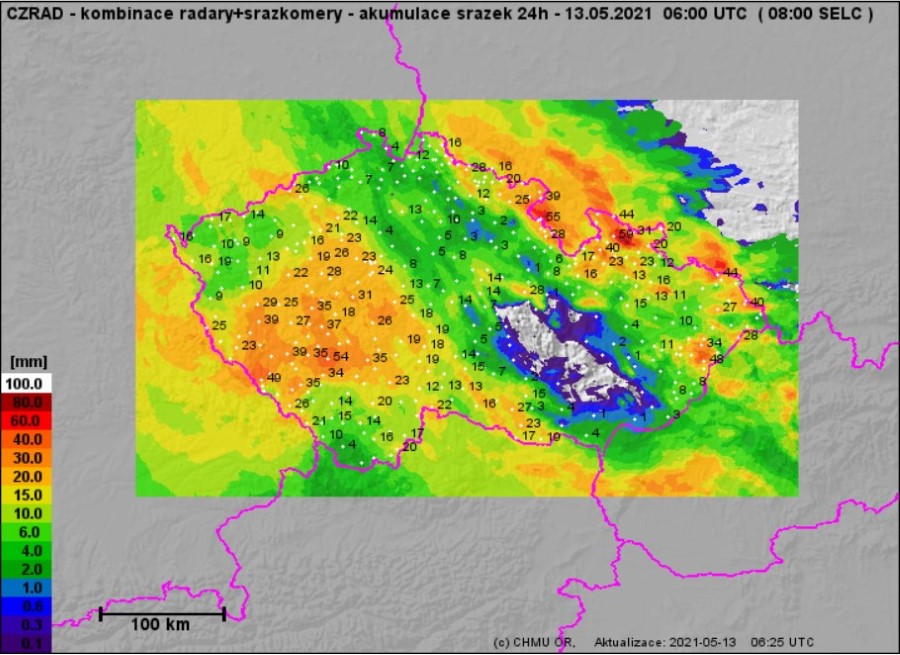 Úhrny srážek za 24 hodin k 13. kětnu 8.00 SELČ: