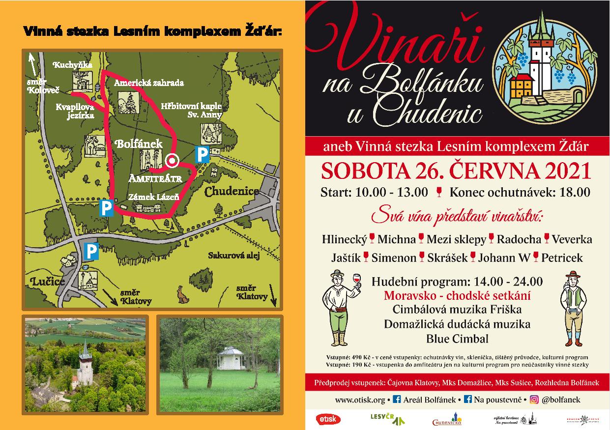Dovolte mi Vás pozvat v sobotu 26. června 2021 od 10:00 do Areálu Bolfánek v Chudenicích v Plzeňském kraji na 5 km dlouhou vinnou stezku s ochutnávkou od 10 vinařů z Čech, Moravy a Rakouska.