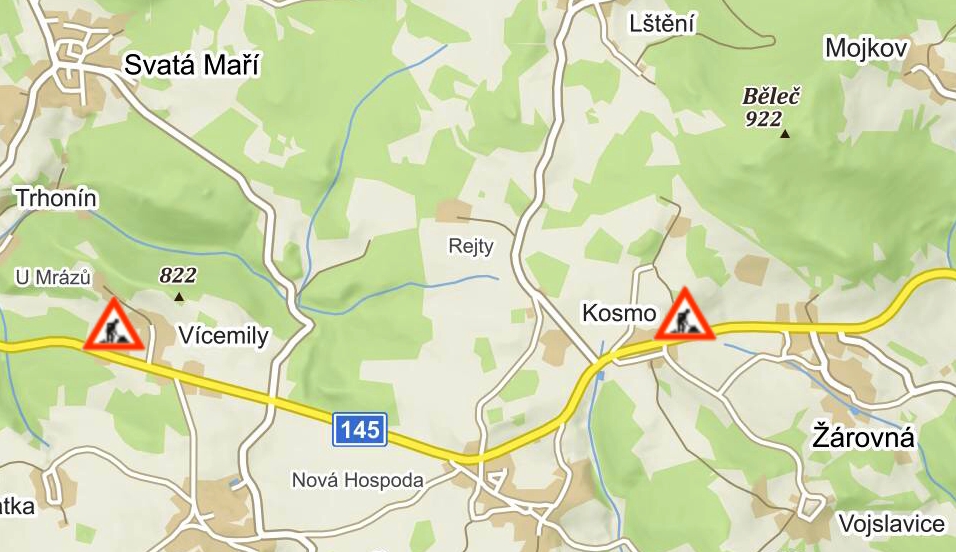 O kousek dál v úseku Kosmo – Žárovná bude rovněž probíhat úprava vozovky v termínu od 08.07. do 18.07.2021. Zde jsou již nyní umístěny červenobílé pruhované sloupky.