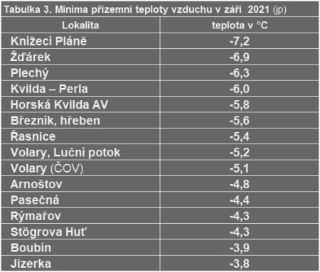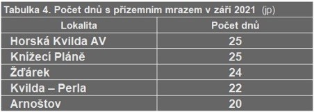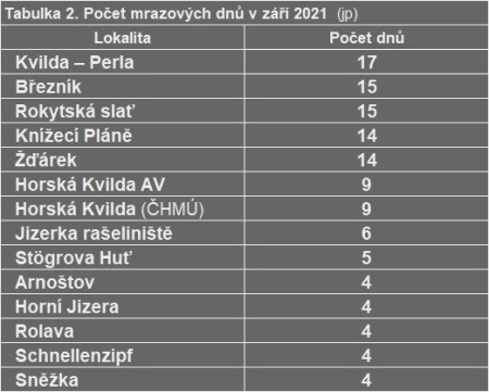 Září bylo na rozdíl od letních měsíců srážkově chudé a slunečné, což vytvářelo také lepší podmínky pro častější výskyt mrazových dnů. To se projevilo významně více v oblasti Šumavy, v porovnání s dalšími tradičně mrazivými oblastmi jiných pohoří, jak uvádí tabulka 2 v přehledu lokalit, kde v září nejčastěji mrzlo. Jako mrazový den je počítán den, kdy teplota vzduchu měřená ve standardní výšce (2 m) poklesne pod bod mrazu v termínu od 21 h místního středoevropského času (SEČ, resp. aktuálně 22 h letního času – SELČ) předešlého dne do 21 h běžného dne. Údaj se zapisuje k příslušnému večernímu termínu.
