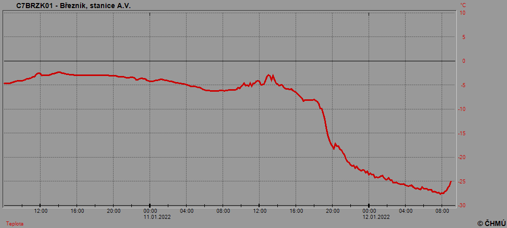 Kolem tlakové výše na střední Evropou proudil na naše území velmi studený vzduch. Díky nočnímu vyjasnění a nedávno napadlé sněhové pokrývce ve formě prachového sněhu klesaly teploty hluboko pod bod mrazu. Nejdéle vydrželo vyjasnění na Šumavě a díky tomu k ránu 6 meteorologických stanic zaznamenalo teplotu vzduchu pod -25 °C. Nejsilnější mráz -27,7 °C byl dosažen v Luzenském údolí na stanici Březník, kde tak byla překonána dosavadní nejnižší naměřená teplota aktuální zimy z Jizerských hor (referovali jsme zde). Přehled stanic s minimální dnešní teplotou vzduchu pod -25 °C poskytuje tabulka níže.
