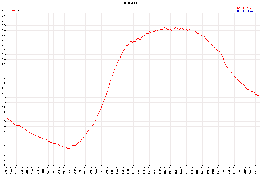 19. květen 2022 přinesl maximální denní teplotu 26,7 °C a to v městské zástavbě v Tolarově ulici, na okraji města u Lučního potoka (stanice ve vlastnictví města) bylo teplotní maximum 26,5 °C, u čístírny odpadních vod dosáhlo maximum téhož dne na 25,9 °C (stanice ČHMÚ).