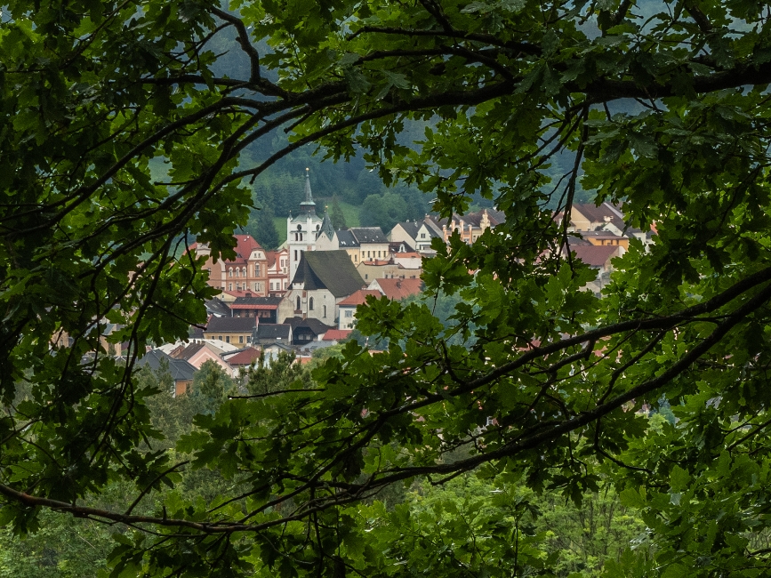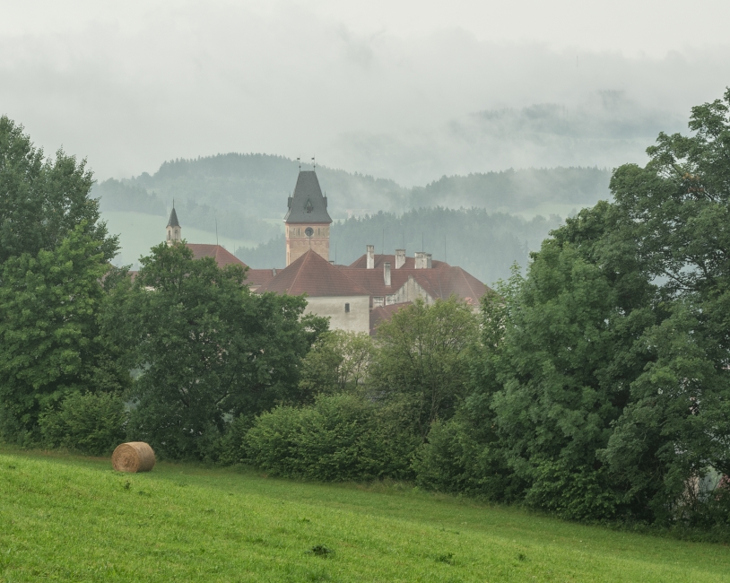 Pod oním stromem, k němuž milý kos přitáhl pozornost, se otevírá zase trochu jiný pohled k již minule zde připomenutému vimperskému zámku – náhle se vynořil v mnohem větším záběru, na němž lze krom věže identifikovat střechu jihozápadního traktu, obě kaple – tedy katolickou sv. Josefa i evangelickou, dále stromy většinově zamaskovaný Haselburg a bohužel nezamaskovaná novodobá stavební zvěrstva, která na historickém území v jeho blízkosti nikdy neměla být povolena, natož realizována.