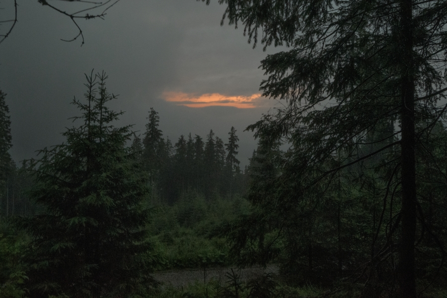 Ano, meteorologický radar v dostatečném předstihu varoval, že z jihozápadního směru se z Německa a Rakouska blíží na Šumavu a český jih mohutná rozsáhlá srážková vlna, ale v minulosti bývaly případy, v nichž se za podobné situace stihla „vyřádit“ cestou a boubínské večery pak vyzněly leckdy přímo pohádkově. Nu, dnešní k podobným nepatřil – i to se tu stává, aniž by tím však výstup tratil na kráse. Již v půli cesty úbočím, kde se navíc brzy ohlásil okraj mlžné čepice, se dalo do drobného deště, který, jako by chtěl člověka napínat, střídal svou intenzitu. Chvilku předstíral, že jen jako krátkodobá mírná přeháňka slábne, aby vzápětí naopak zesílil a zkoumal, zda tím jednoho dokáže odradit od pokračování v cestě. Samozřejmě neodradil, jen se přičinil o silný pocit, že tu vlastně probíhá jakýsi vnitřní nonverbální dialog.