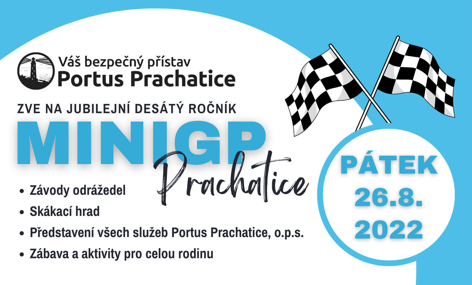 Poslední srpnový pátek roku 2022 bude opět patřit všem malým i větším závodníkům, kteří seberou odvahu a přijedou porovnat své síly na závod odrážedel. Desátý ročník závodu MiniGP proběhne 26. srpna 2022 na dopravním hřišti u koupaliště Hulák. Startovné je 50 Kč. Závodit se bude ve třech věkových kategoriích. Čtvrtá speciální kategorie bude věnována dospělým.