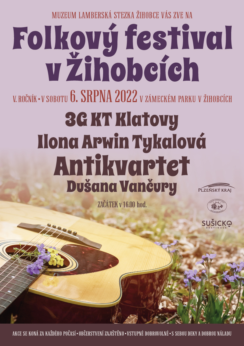 Muzeum Lamberská stezka všechny srdečně zve na již 5. ročník tradičního Folkového festivalu, který se koná 6. srpna 2022 od 16:00 v krásném prostředí Zámeckého parku v Žihobcích. Letos se návštěvníkům představí folkové a country kapely 3G Kt, Antikvartet Dušana Vančury a zpěvačka Ilona Arwin Tykalová. Akce se uskuteční za každého počasí. Občerstvení a skvělá atmosféra jsou zajištěny.