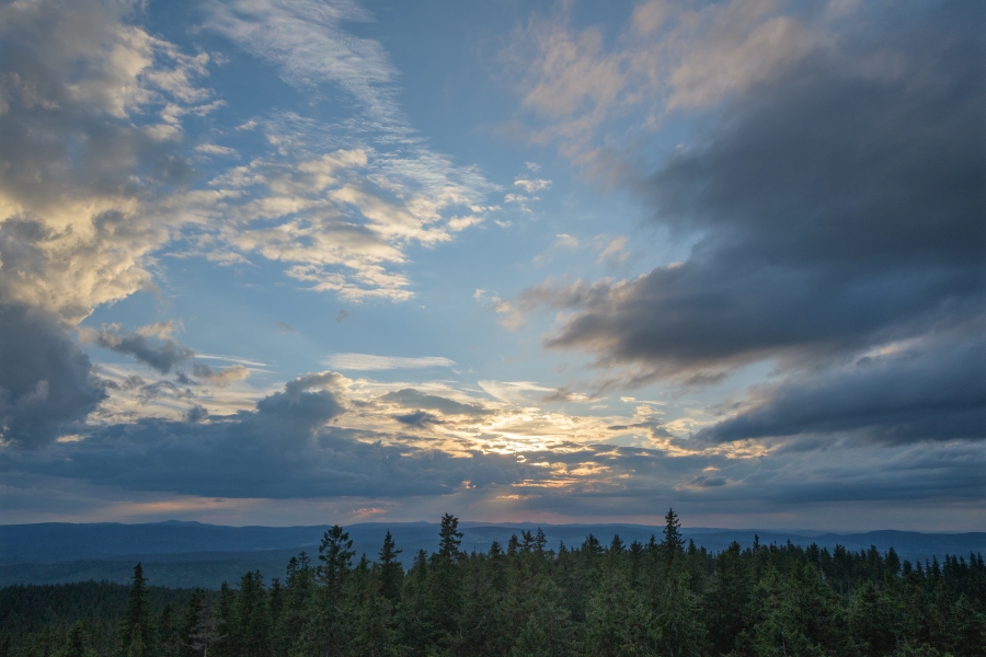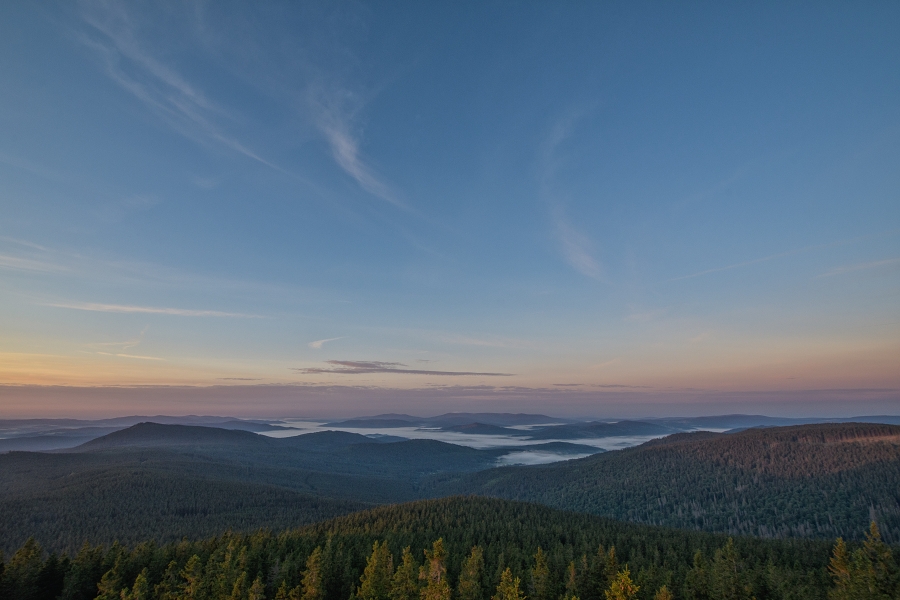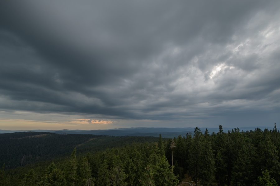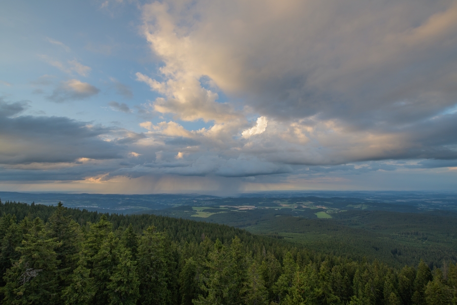 Nejpůsobivější je ovšem vždy kombinace náležitě barevné a vytvarované oblačnosti s mlhami stoupajícími z bohatě deštěm nasycených lesů – večerní Šumava potvrdila, že nouzí o vodu skutečně koncem týdne nestrádá.