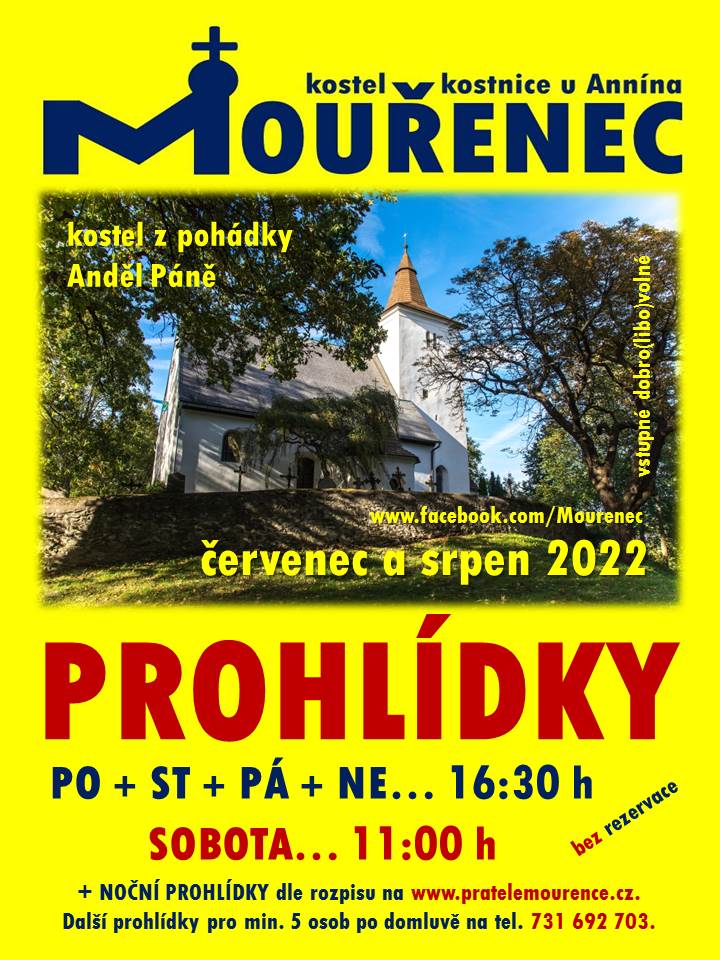 Stále běží i prázdninový režim komentovaných prohlídek. Až do 31. srpna (včetně) můžete přijít v pondělí, středu, pátek, neděli v 16:30 hodin a v sobotu v 11 hodin (toto platí po celý rok včetně prázdnin). Od září pak můžete Mouřenec navštěvovat vždy v sobotu v 11 hodin.