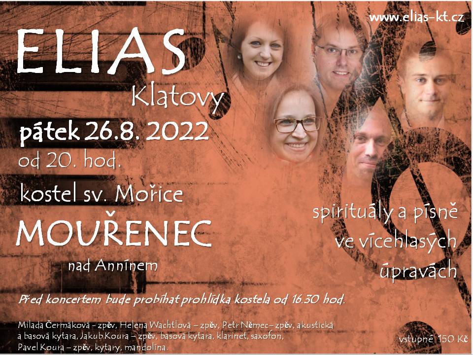 Máme pro vás ještě jeden příjemný koncert. V pátek 26. srpna od 20 hodin u nás už zahraje a zazpívá klatovská kapela Elias. Těšit se můžete na spirituály a další písně ve vícehlasých úpravách. Vstupenky za jednotnou cenu 150,00 Kč budou k dostání na místě před koncertem.