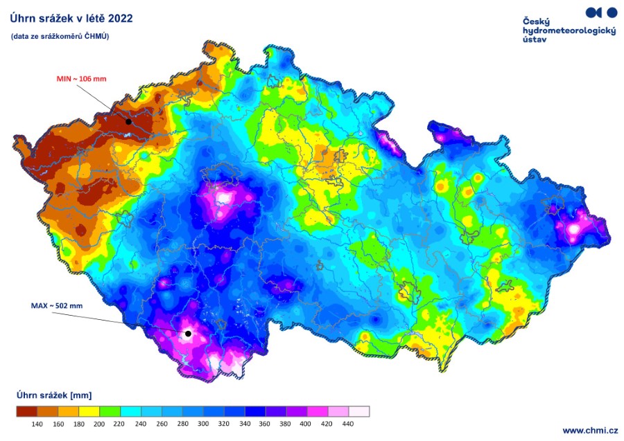 Je za námi klimatologické léto, které trvá od 1. června do 31. srpna. Český hydrometeorologický ústav (ČHMÚ) na své facebookové stránce zveřejnil mapu s úhrny srážek za výše uvedené období. Jak je z mapy patrné, srážky byly rozloženy na území republiky velmi nerovnoměrně. Nejsušší byl západ republiky a to kraje Karlovarský, částetečně Plzeňský a Ústecký. Naopak nejvíce srážek spadlo v části kraje Jihočeského, Středočeského, Moravskoslezkého a v jižní části Prahy.