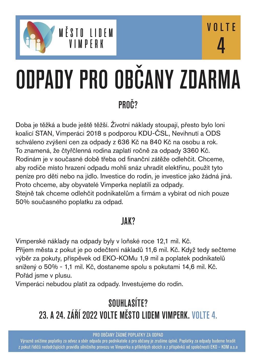 Proto chceme, aby lidé ve Vimperku a osadách měli odpady zdarma a podnikatelé platili půlku dosavadního poplatku. Na úhradu zpracování odpadů budou použity především pokuty z překročení rychlosti ve Vimperku a okolních obcích. Tento krok obyvatelům Vimperka v současné době jistě pomůže.