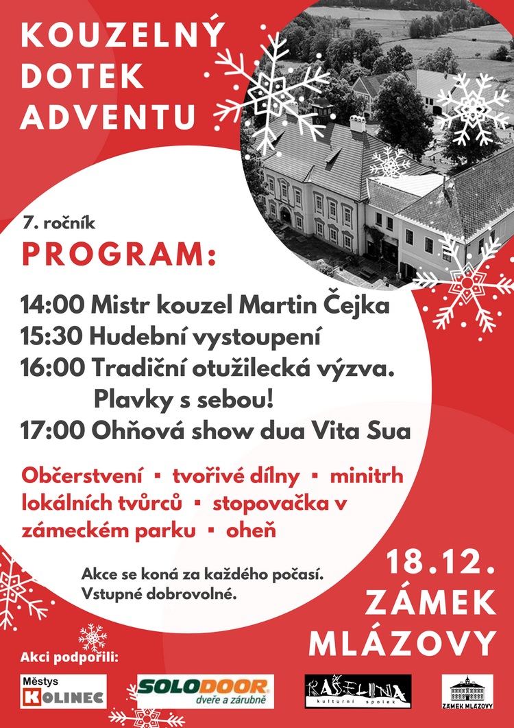 Dovoluji si Vás pozvat na již tradiční předvánoční akci na Zámku Mlázovy – Kouzelný dotek adventu v neděli 18.12. odpoledne.