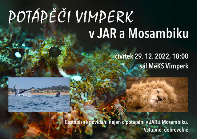Dnes 29.12. v 18:00 hod bude v sále MěKS Vimperk cestopisné povídání nejen o potápění v JAR a Mosambiku.