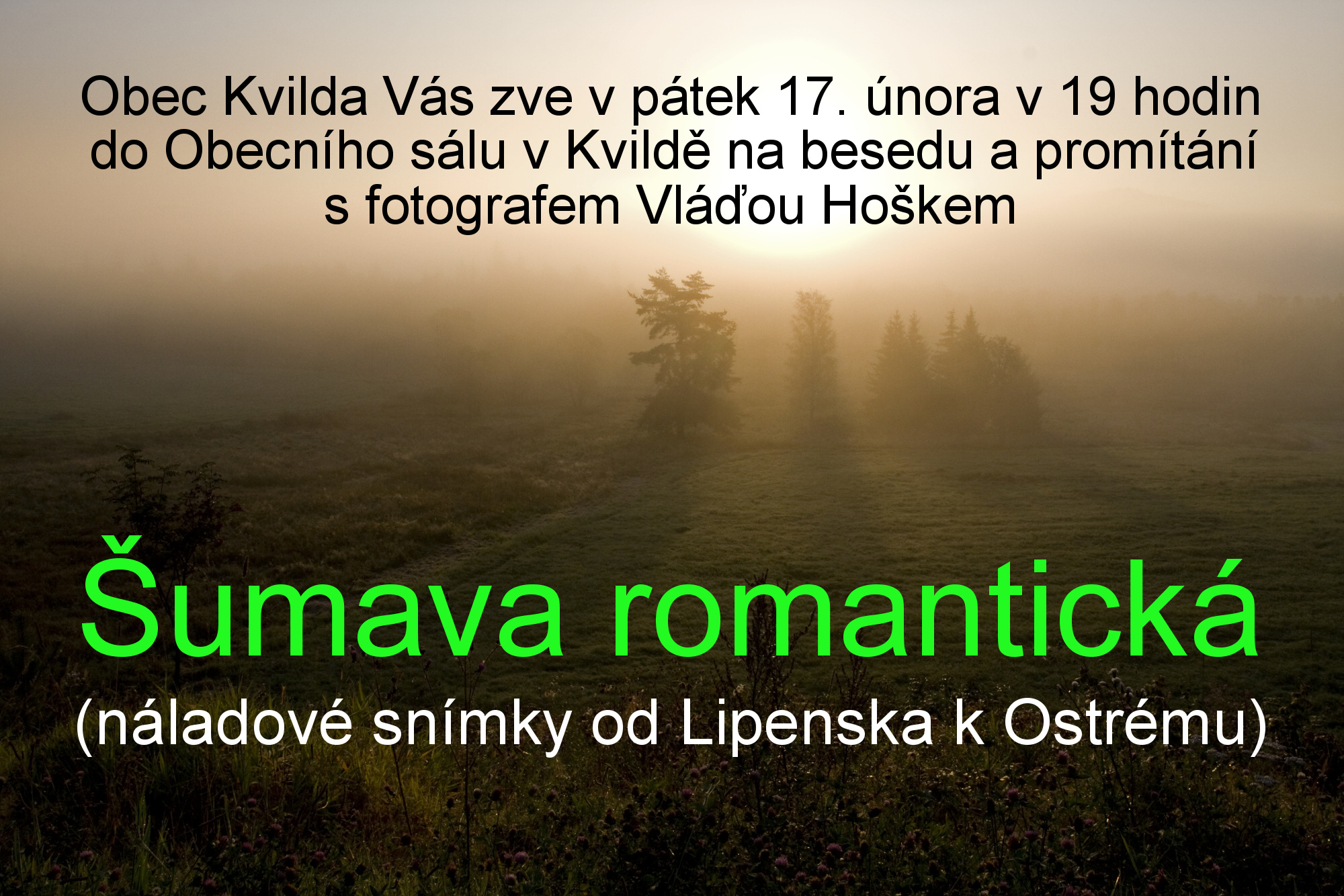 Obec Kvilda a šumavský fotograf Vláďa Hošek Vás zvou na besedu a promítání náladových snímků ŠUMAVA ROMANTICKÁ.