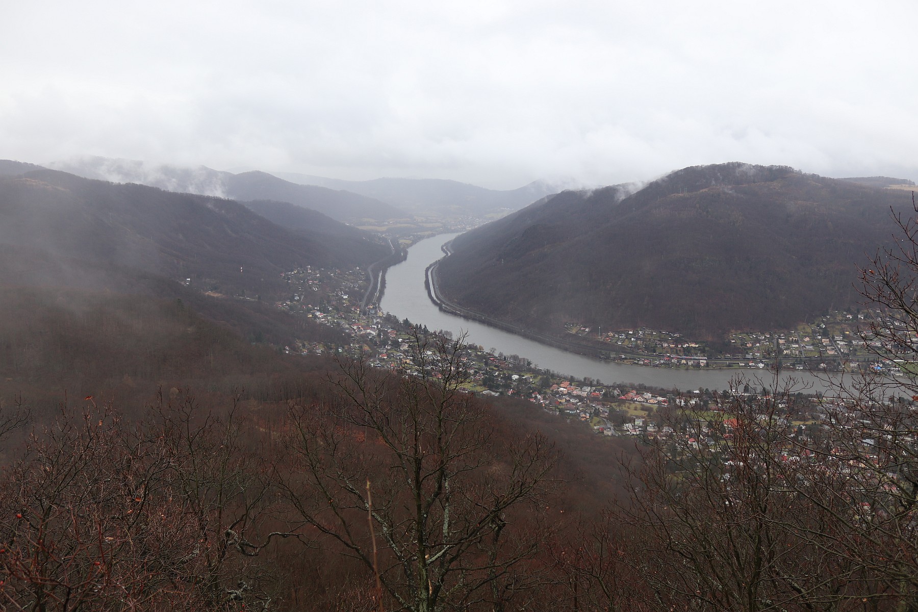 Dnes tu stojím s Klubíčkem. Vítr hučí ve větvích, zasypávají nás kapky. Corliss je přivázaná k lavičce, dívá se na nás na vrchol skály, odkud se snažíme zahlédnout něco z krásy hor. Občas začne výt, je ustrašená, že ji tu necháme, ale možná je jí taky trochu zima. Ochladilo se, asi už přešla studená fronta. A opět ten vířící oblak, sloupy očišťujících par stoupajících v závětří a znemožňujících nám kochat se pohledem na Labe a Portu Bohemicu. Nakonec se páry rozpouští a na chvilku můžeme pozorovat, jak se kovově lesklý had Labe vine mezi úbočími a příkrými svahy.