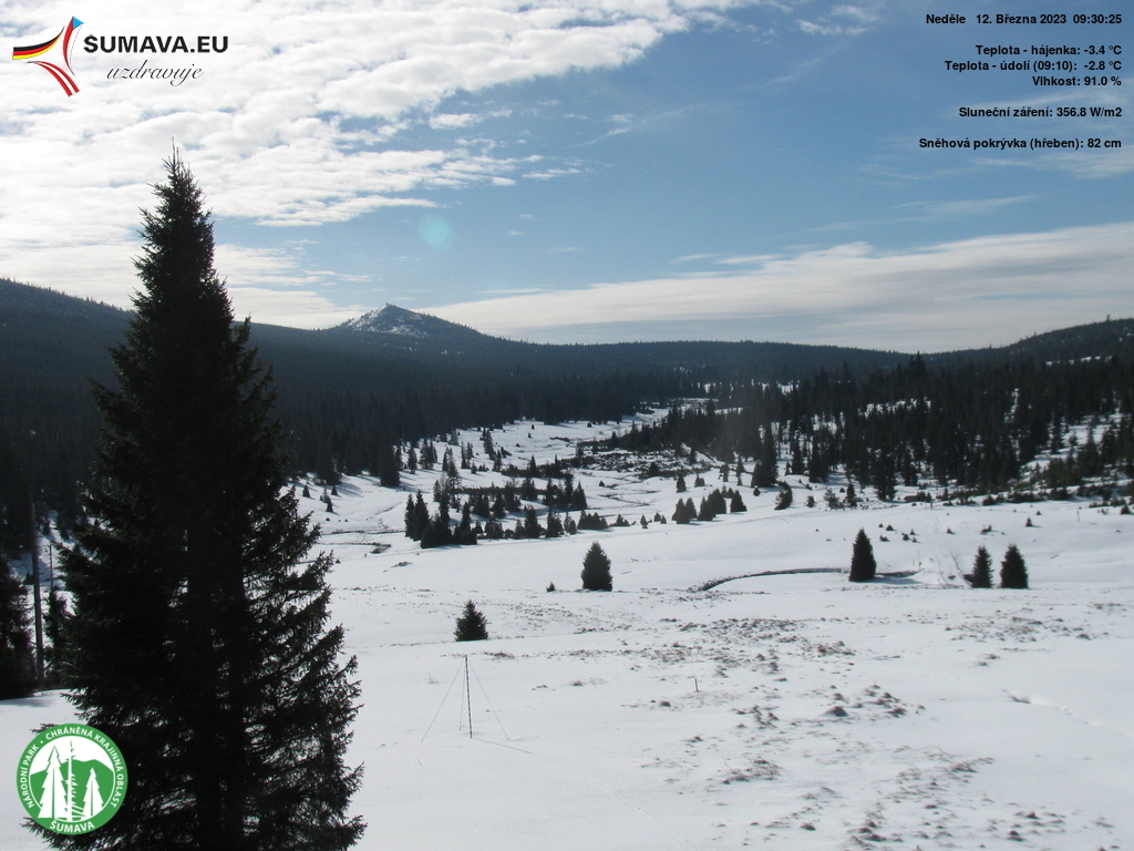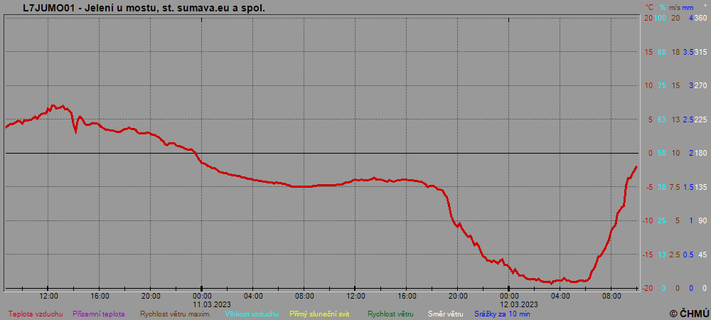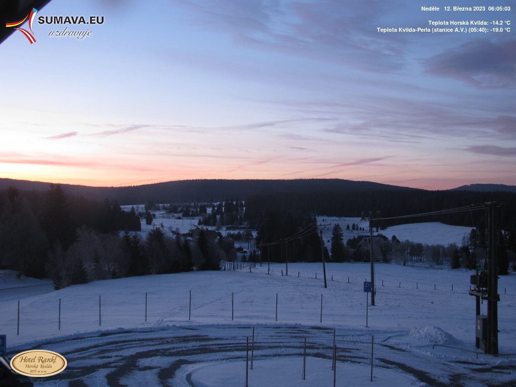 Po podmračené a studené sobotě se v části noci na neděli projasnilo. Teplota ve Vimperku klesla na -6,7°C. Ještě mrazivěji bylo na Horské Kvildě – tamní stanice zaznamenaly mráz -15,9°C až -16,7°C. Vedlejší stanici Kvilda Perla dosáhla -19,1°C. Nejmrazivěji bylo na naší stanici Jelení v Krušných horách a to -19,4°C. Noc nebyla celá plně jasná, pokud by tomu tak bylo, teploty by poklesly pod -20°C. Po oteplení v druhé půli týdne a prudkém poklesu v noci na sobotu se nám v nedělním slunečném předpoledni začíná znovu oteplovat. Výrazně se má oteplit v pondělí 13.3.