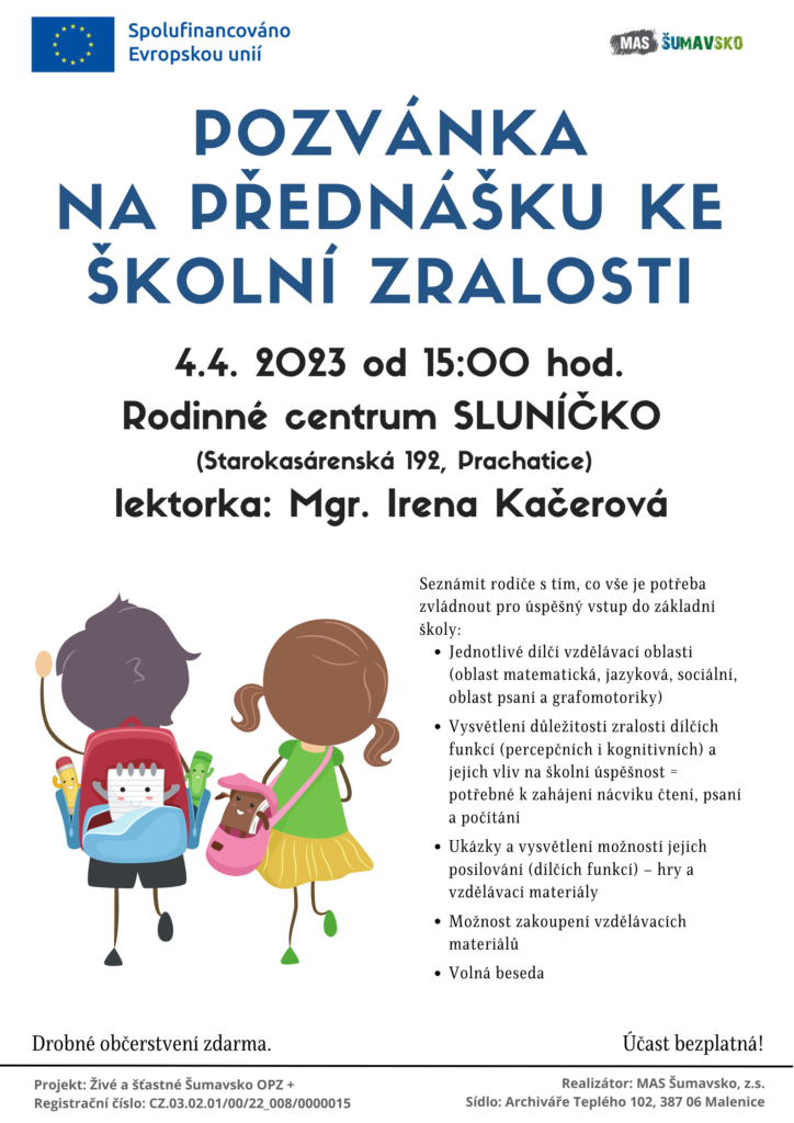 Portus Prachatice, o.p.s. ve spolupráci s MAS Šumavsko, z.s. srdečně zve rodiče předškolních dětí na zajímavou přednášku věnovanou školní zralosti. Proběhne v úterý 4.4. 2023 od 15. hodin v Rodinném centru Sluníčko pod vedením lektorky Mgr. Ireny Kačerové.