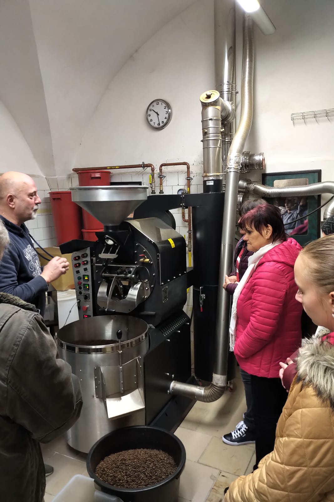 Nejprve nás přivítal majitel pražírny pan Ivan Lauda. Dozvěděli jsme se, jak a kde rostou kávovníky a jak se získávají kávová zrnka z plodů, která se podobají našim třešním. Uvnitř každého plodu se nachází dvě zrnka kávy. Dužnina se oddělí a zůstanou zrnka, která mají zelenou barvu a nevypražená se nedají konzumovat. Celý proces pražení kávy mohli žáci vidět přímo v praxi.