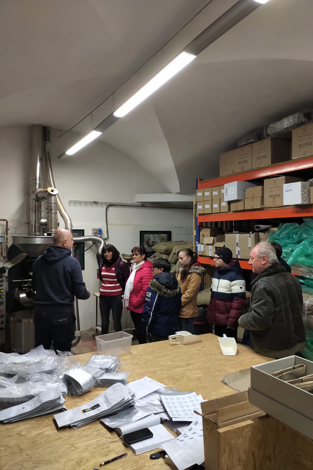 Nejprve nás přivítal majitel pražírny pan Ivan Lauda. Dozvěděli jsme se, jak a kde rostou kávovníky a jak se získávají kávová zrnka z plodů, která se podobají našim třešním. Uvnitř každého plodu se nachází dvě zrnka kávy. Dužnina se oddělí a zůstanou zrnka, která mají zelenou barvu a nevypražená se nedají konzumovat. Celý proces pražení kávy mohli žáci vidět přímo v praxi.