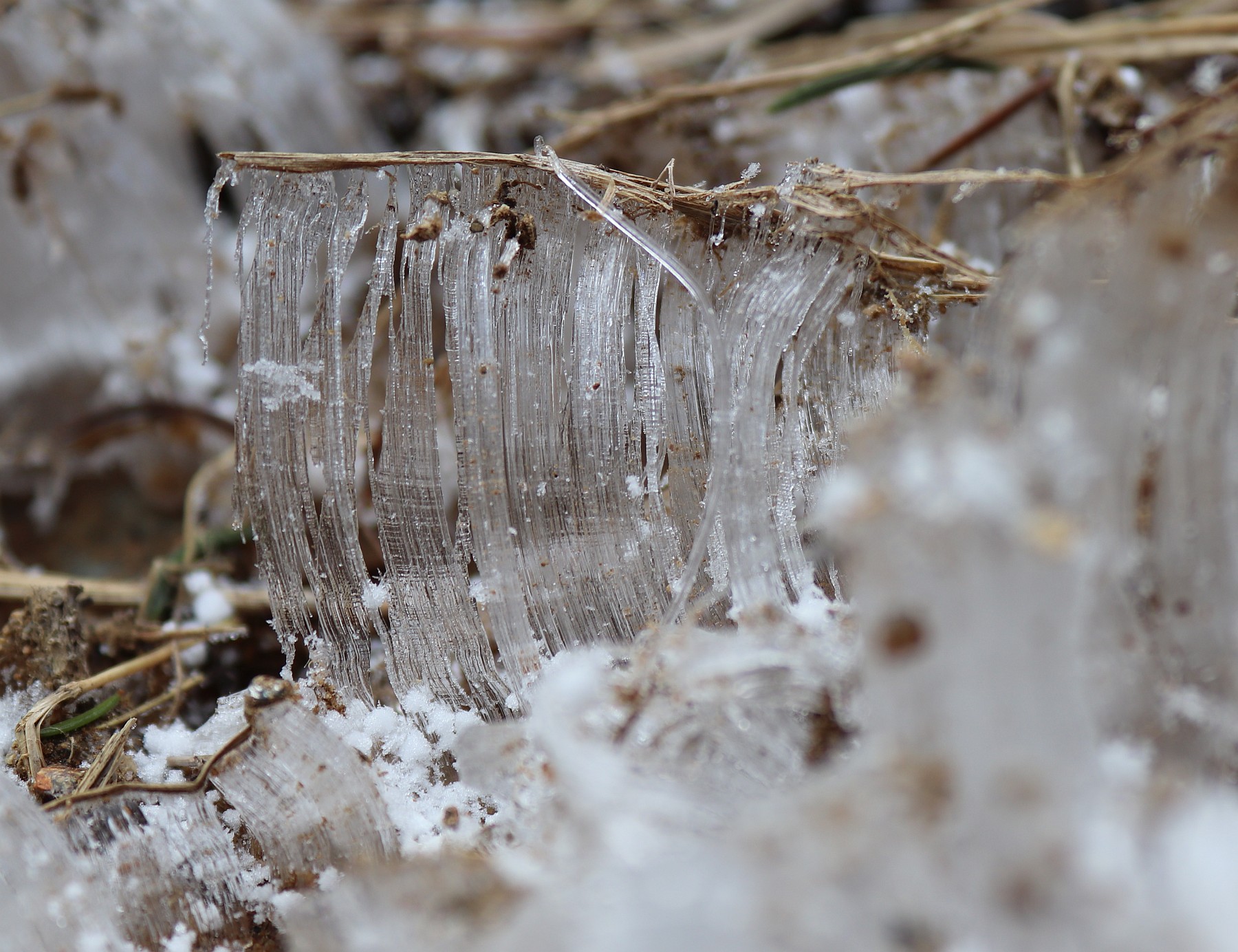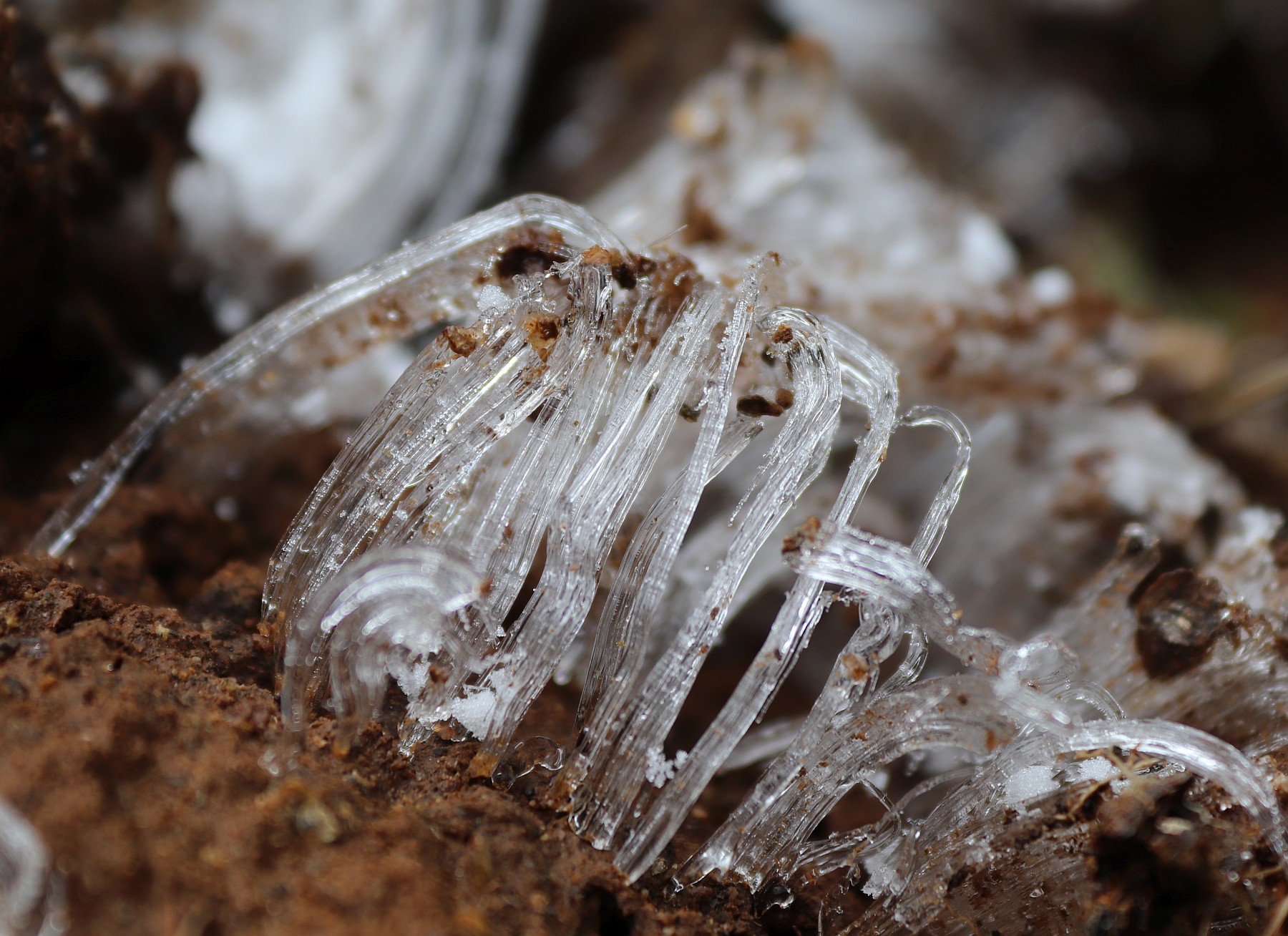 Na cestách se objevily ledové květy. Vyrostly z hlíny, kterou už stačilo trochu prohřát jarní slunce, aby se pak nad ní rychle ochladilo a voda, která je v ní obsažená, zvětšila při změně skupenství svůj objem. Místy se zdá, že vypučely z popadaných smrkových jehliček nebo slabých kořínků či stébel. Jako by pod zemí ukrytý drak vyslal vzhůru svůj teplý dech, který hned ztuhl v drúzy krystalů nebo ve výhonky a pokroucené stvoly připomínající rozvíjející se číslice s bříšky. Někde se podobají harfám s napnutými strunami natěsno přimknutými k sobě, jinde zase stuhovým bleskům s vodivými kanály posunutými rovnoběžně blízko vedle sebe.