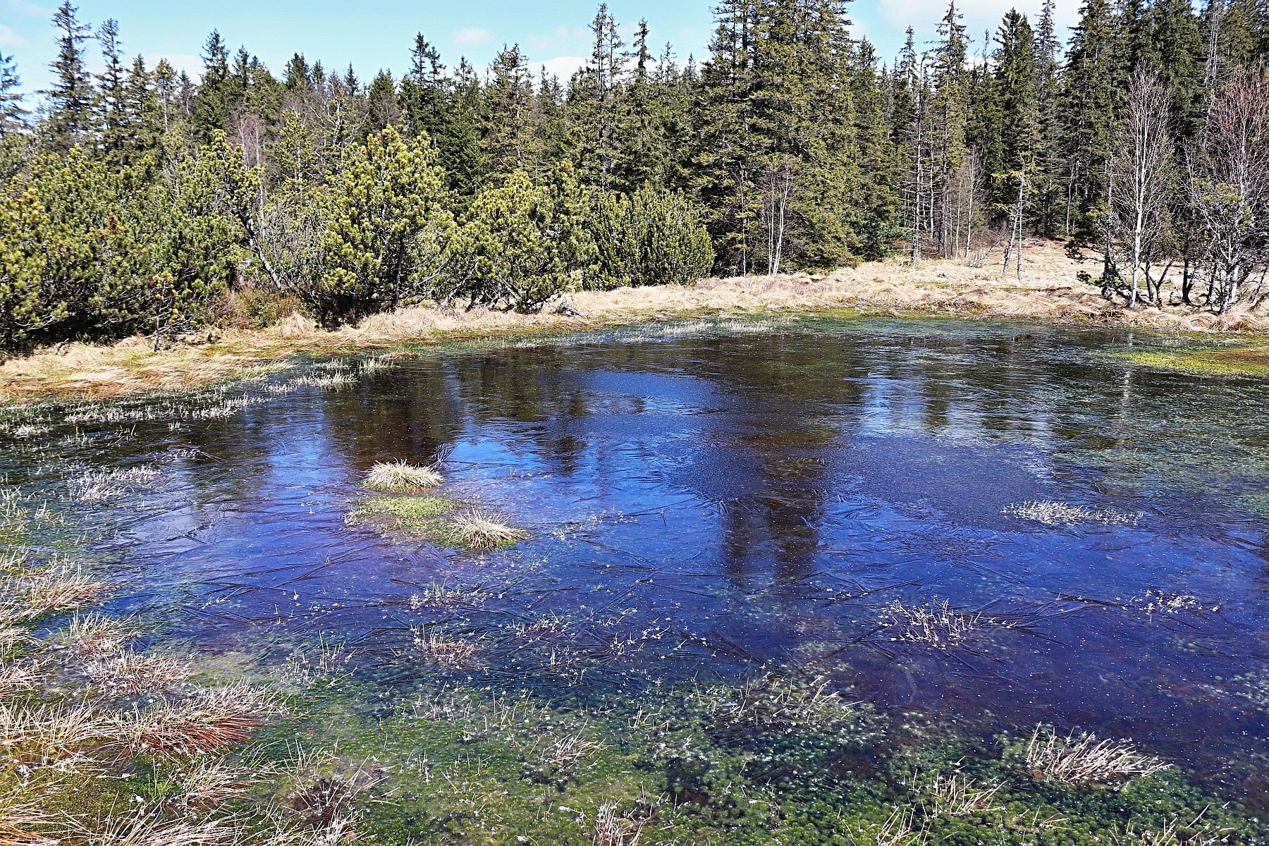 Jdu se podívat na Malý Polec. Cestou si z jalovce utrhnu tři modré jalovčinky. Rád je jen tak žvýkám, ale nesmím to přehnat, prý dráždí ledviny. Holá země je zmrzlá na kost. Protože mám gumové holínky, ještě nad cestou, co vede pod stanicí, se poroučím k zemi. Ještě že mě časté pády naučily padat. Slať je podmáčená, houpe se pode mnou, jak se snažím dostat se co nejblíže k jezírku. Je dnes jasno a chci vidět jeho hluboký pohled. A skutečně, jezírko je zabarvené sytou kobaltovou modří. Pokrývá ho slabá krusta ledu, která ho oslepila. Je zahleděno do sebe. Když dojdu až k němu, trhliny v krustě se rozechvějí, stejně jako rašelina na břehu, ta záludná hmota. Nejde ani tak o to, že si člověk nabere do bot nebo zmáčí nohavice, nejhorší je sevření nohy. Musím se vyhnout přenášení váhy z jedné nohy na druhou. Jak vysouvám z rašeliny holiny a zase se do ní propadám, zní to, jak když mi kardiolog vyšetřuje na echokardiografii srdce. Je slyšet jeho puls v podobě čvachtavých zvuků.
