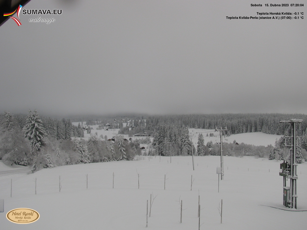 Další dny byly chladnější, podmračené se střídavými srážky, k ránu s teplotou i pod nulou. Od čtvrtečního pozdějšího odpoledne se rozpršelo na 2 dny trvale. Ochlazení přineslo do poloh nad 900 m.n.m a výše trvalé a vydatné sněžení. V pátečním a sobotním ránu mokré sněžení kleslo i do spodní části Vimperka a louky nad městem byly dopoledne bílé. Na horách napadlo 20 až 40 cm sněhu. Týden nám přinesl vysoké srážky, přes 57 mm, doplnil spodní vody, naplnil koryta řek. Nahradily jarní tání z hor, které by se letos nekonalo, protože z celého naše povodí, až po nejvyšší okolní vrchol – Boubín 1362 m.n.m, zásoby vody ve sněhu už před časem roztály. Chladnější první polovina dubna nám srovnává předstih vegetace z konce měsíce března.