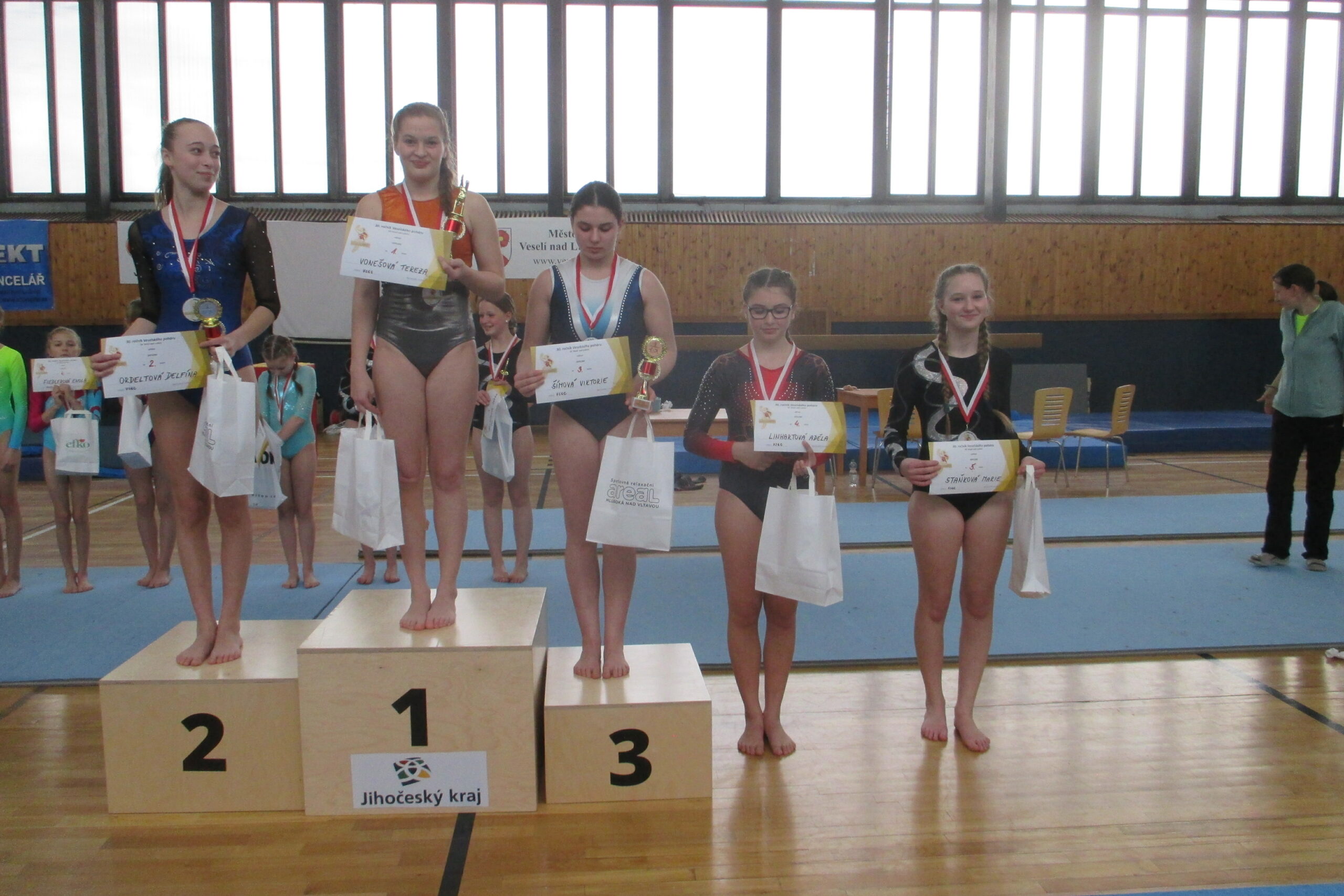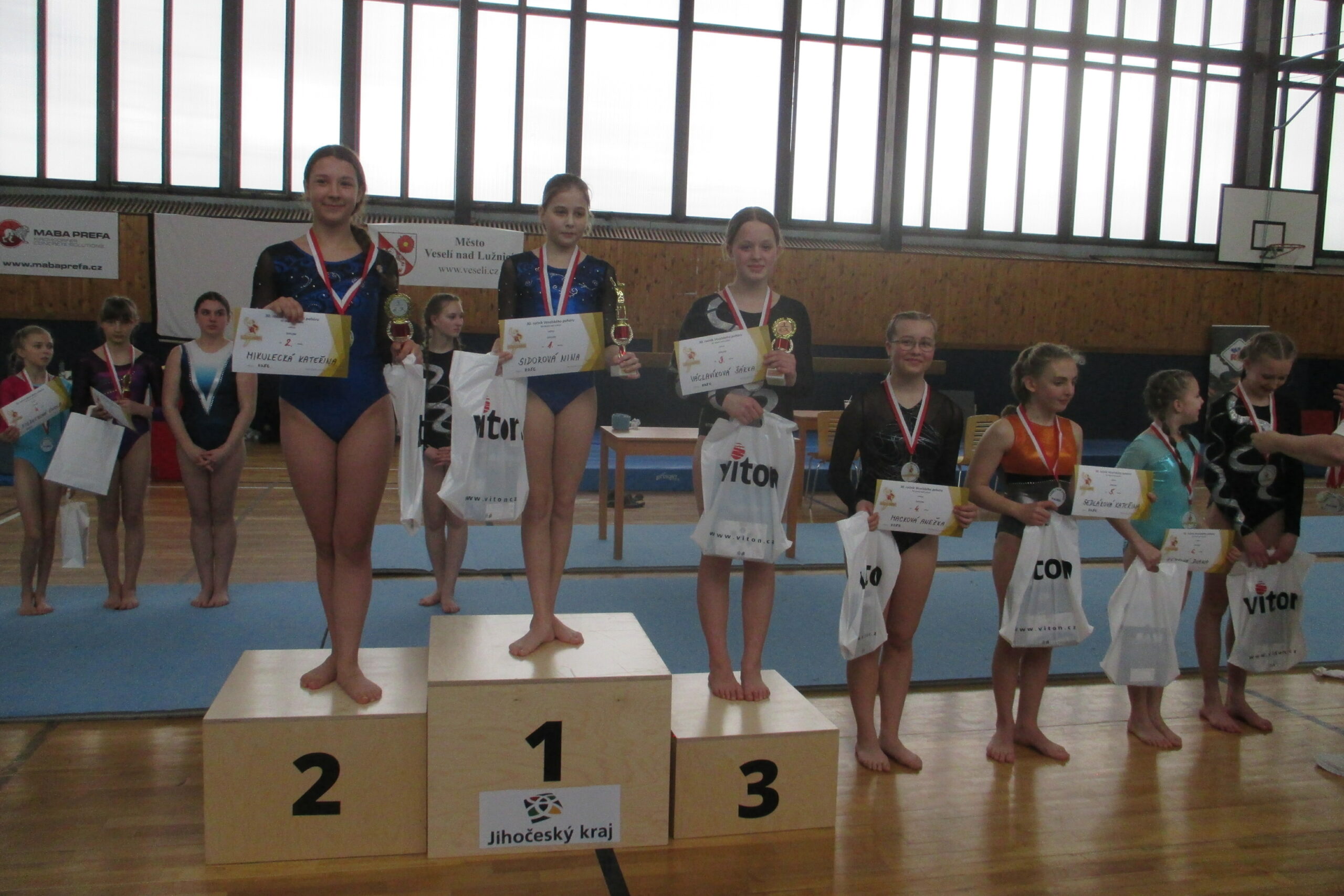 Starší děvčata soutěžila odpoledne. V kateg. VS5C Vimperk zastupovala Anetka Hlinková a Šárka Václavíková. Šárka je již zkušená závodnice a byla radost sledovat její projev na kladině a prostných. Na bradlech zvládá vzklopky, toče i obtížné napojování prvků. Zaslouženě se na stupních vítězů radovala z poháru za třetí místo. Anetka měla sice třetí nejlepší známku za sestavy na kladině a na prostných, ale ještě úplně nezvládá přeskok a bradla. I tak je sedmé místo na kraji pěkný výsledek.
