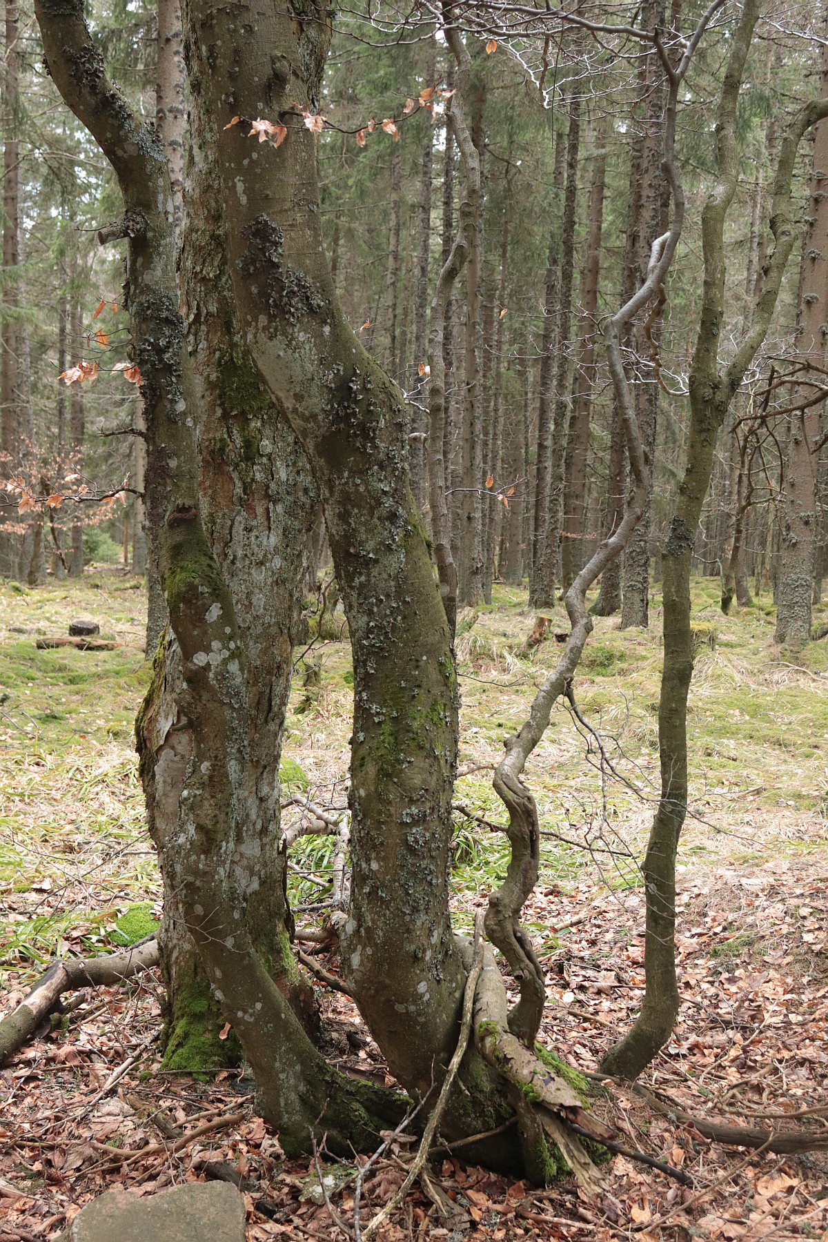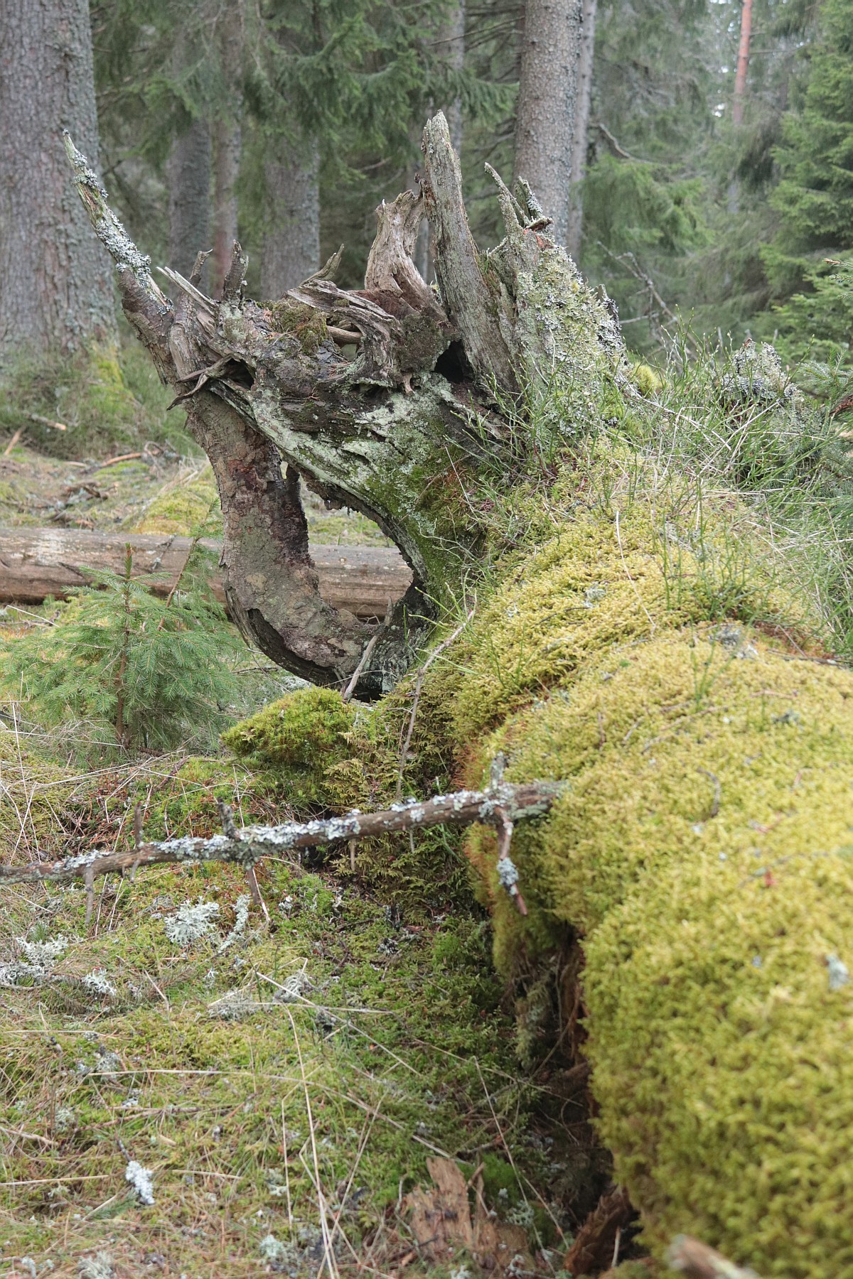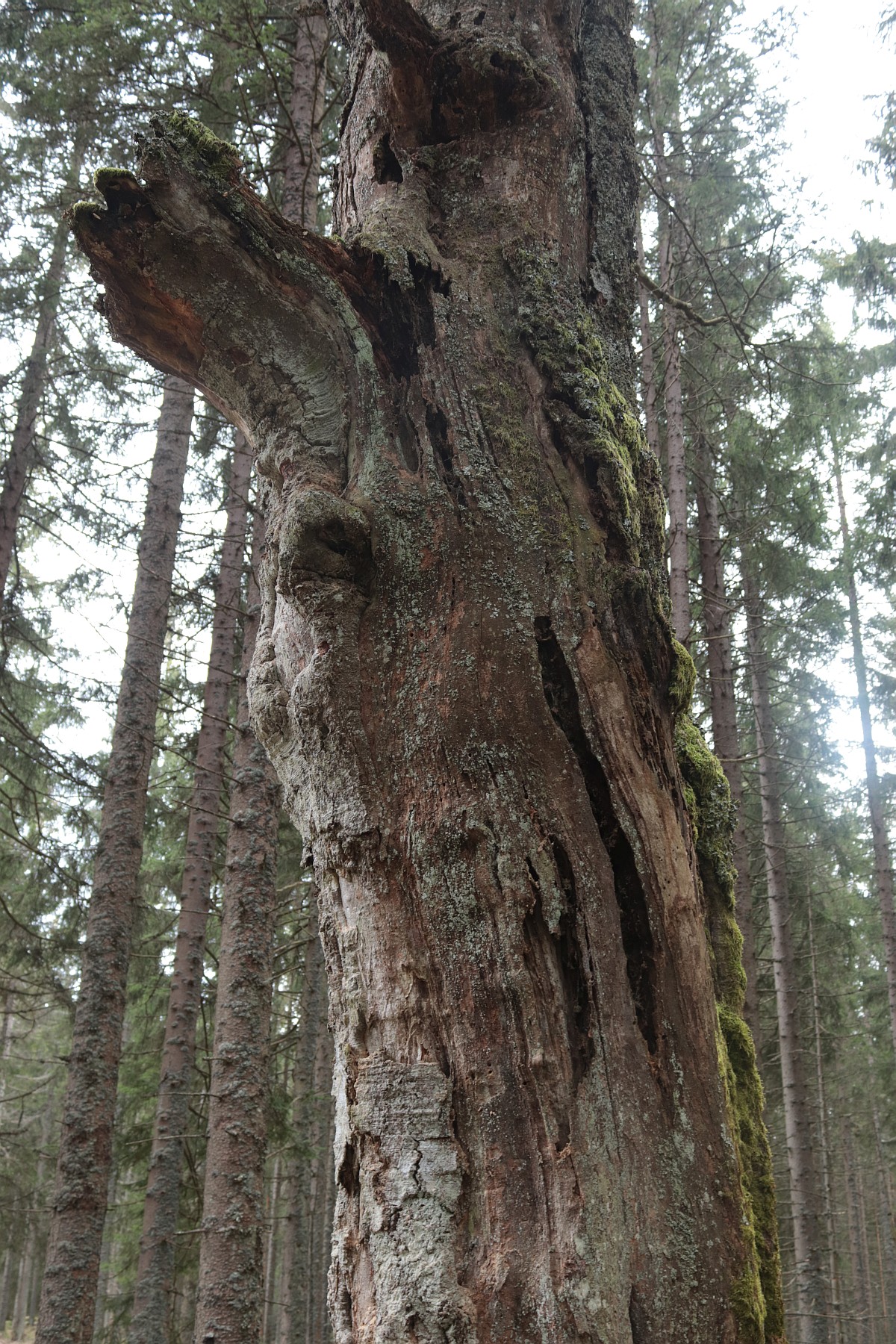 Smrkový les mě svojí monotónností nudí. Jednotlivé stromy jsou uniformní a svými přímými kmeny připomínají shluk vyzáblých těl na jakémsi shromaždišti. Snad jen ve vichřici takový les oživne. Pak se k sobě koruny naklánějí a zase se od sebe vzdalují, ale tady po oba dny vládne bezvětří. Jakmile se mezi smrky objeví pokroucený a často uhnilý kmen buku nebo javoru, hned oživnu, jako bych ve městě na betonové zdi objevil abstraktní obraz. A čím je kmen poničenější a ztrouchnivělejší, tím více fantazie ve mně probouzí. Na některých místech trčí z lesní půdy už jen pahýly někdejších urostlých stromů. Možná se rozpouštějí cestou kořenů zpět v zemi.