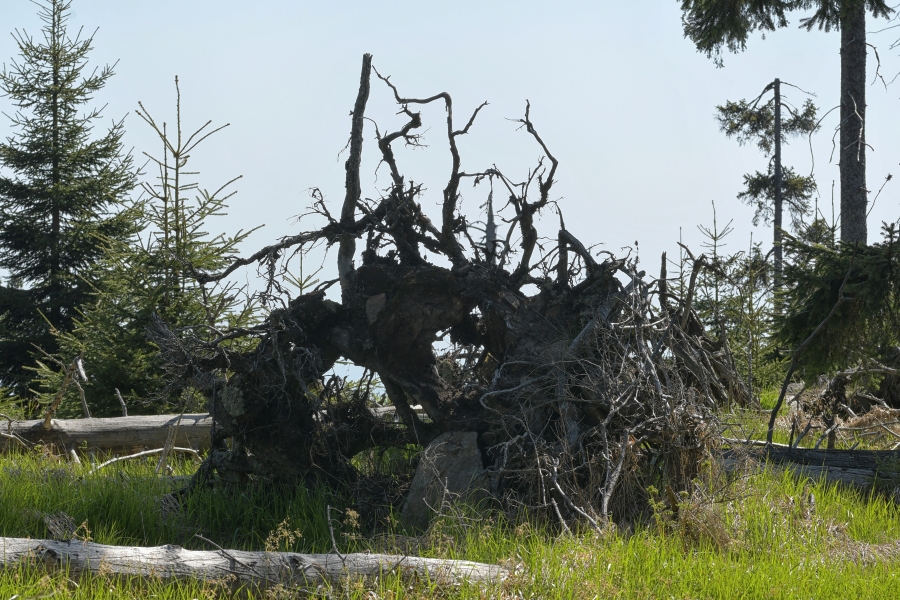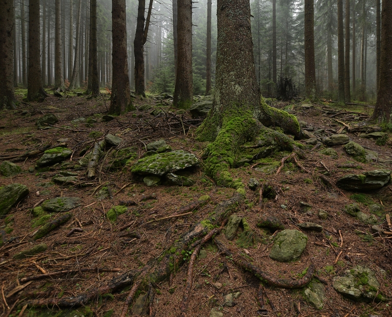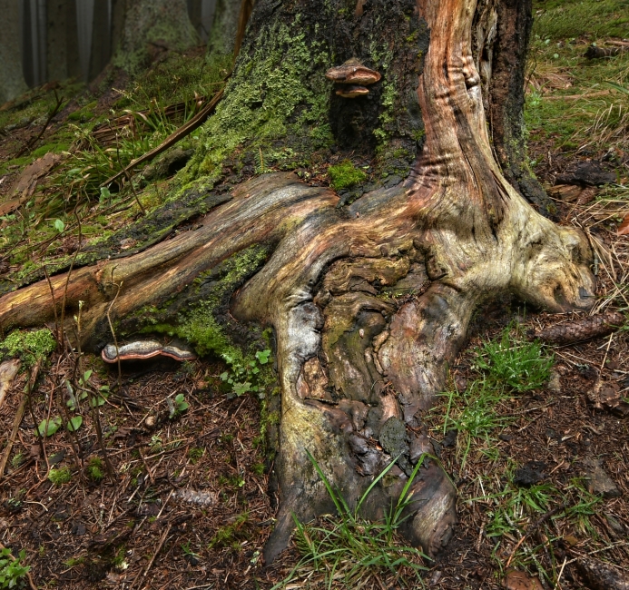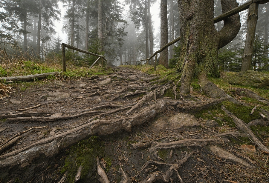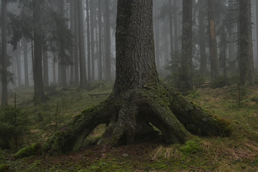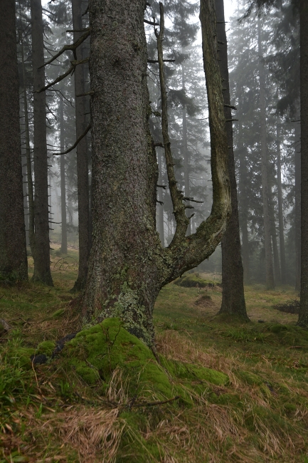 … a situace podobné té dnešní člověka přimějí sklonit se k zemi a pátrat po zajímavých námětech, jakých naše krásné lesy nabízejí bezpočet. Třeba zde – jako by letitý smrk, dávno uvyklý pozdravům při každém míjení, natáhl v ústrety jeden za svých vzdušných kořenů co obdobu lidského podání ruky.