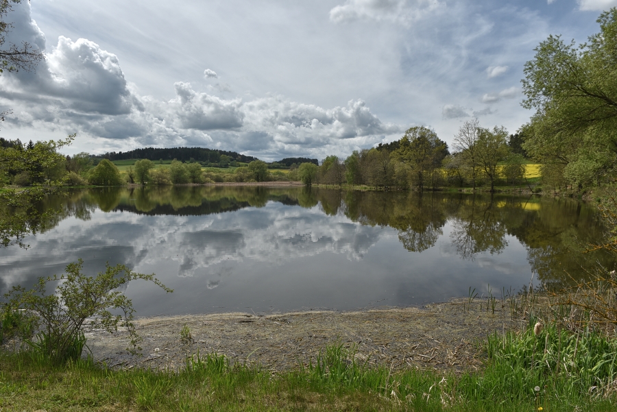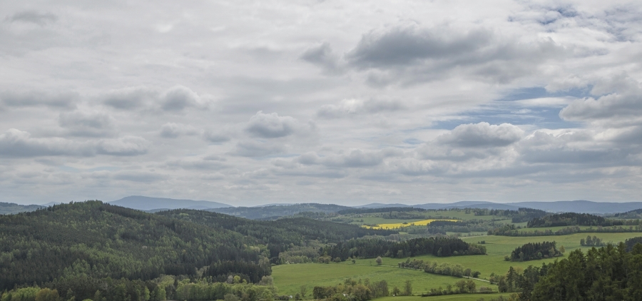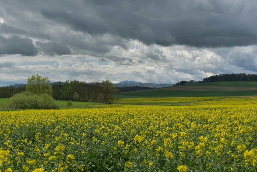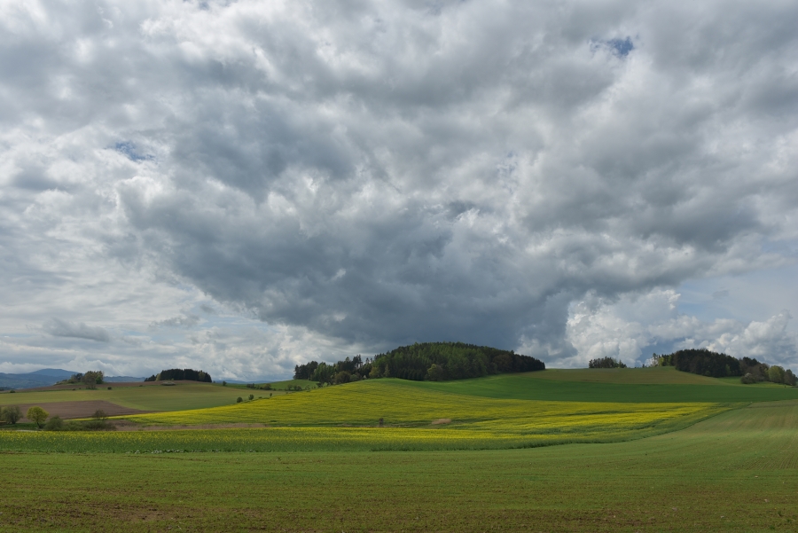 Šestá májová obloha se blýskla mimořádnou oblačnou výzdobou, úžasně kontrastující s krajinou, občas barevně zpestřenou řepkovými poli.