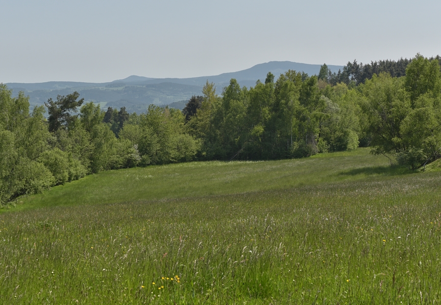 Pohledy z rozkvetlých horských luk k šumavským velikánům jsou vždy inspirativní, a to i když obloha namísto zajímavých mračen nabízí jen jediný odstín své barvy.