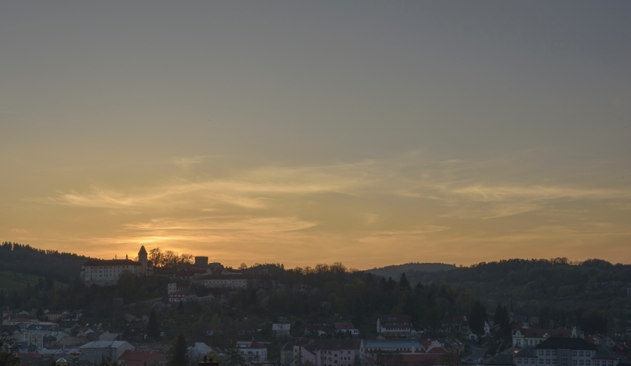 … že se naskytl pohled na sluneční rozloučení i jeho působivé doznívání nad jinak stále zamračeným obzorem, neslibujícím nadcházející druhé májové sobotě žádnou zásadní změnu nálady.