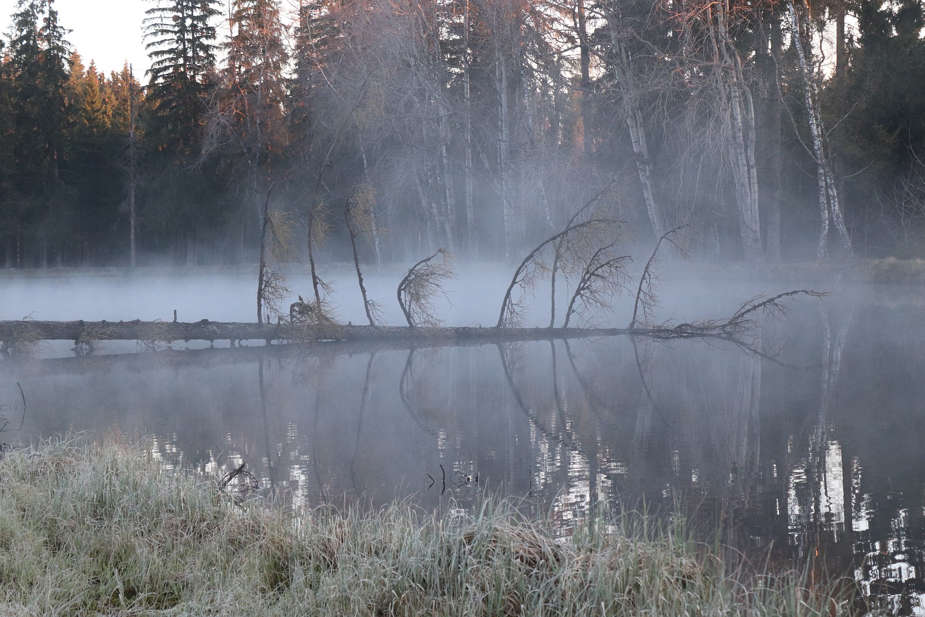 U Kramat zpívá celý sbor ptáků. Prim hraje drozd, který tu má své teritorium, slyším ho, kdykoliv jedu okolo. Stromy trčí ze sivé vaty mlhy, která se pomalu zvedá z hladiny. Jeden ze smrků leží v rybníku, jeho suché větve trčí z vody a odrážejí se od hladiny pod sebou, vykreslují kostru zpola vynořené ryby. Břeh je podmáčený, nevím, zda je to on, který zachytává a svírá mé kroky, nebo jsou to mé kroky snažící se ho uchvátit? Květy blatouchů pokrylo jíní.