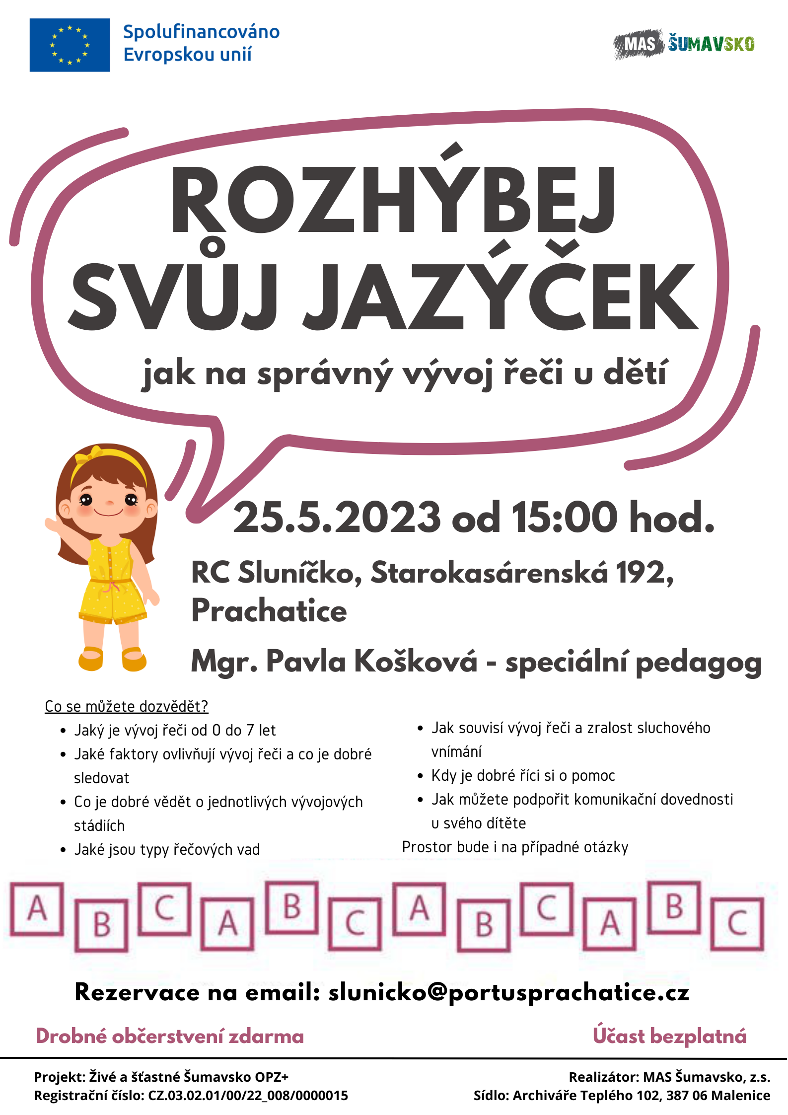Rodinné centrum Sluníčko (Portus Prachatice, o.p.s) a MAS Šumavsko, z. s. zvou na přednášku na téma správného vývoje řeči u dětí do sedmi let.