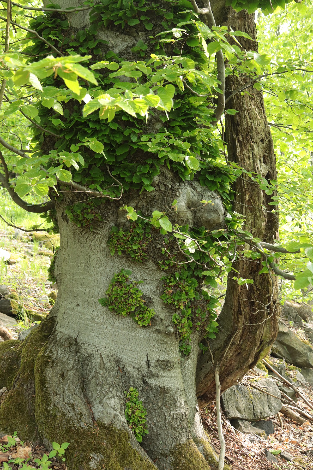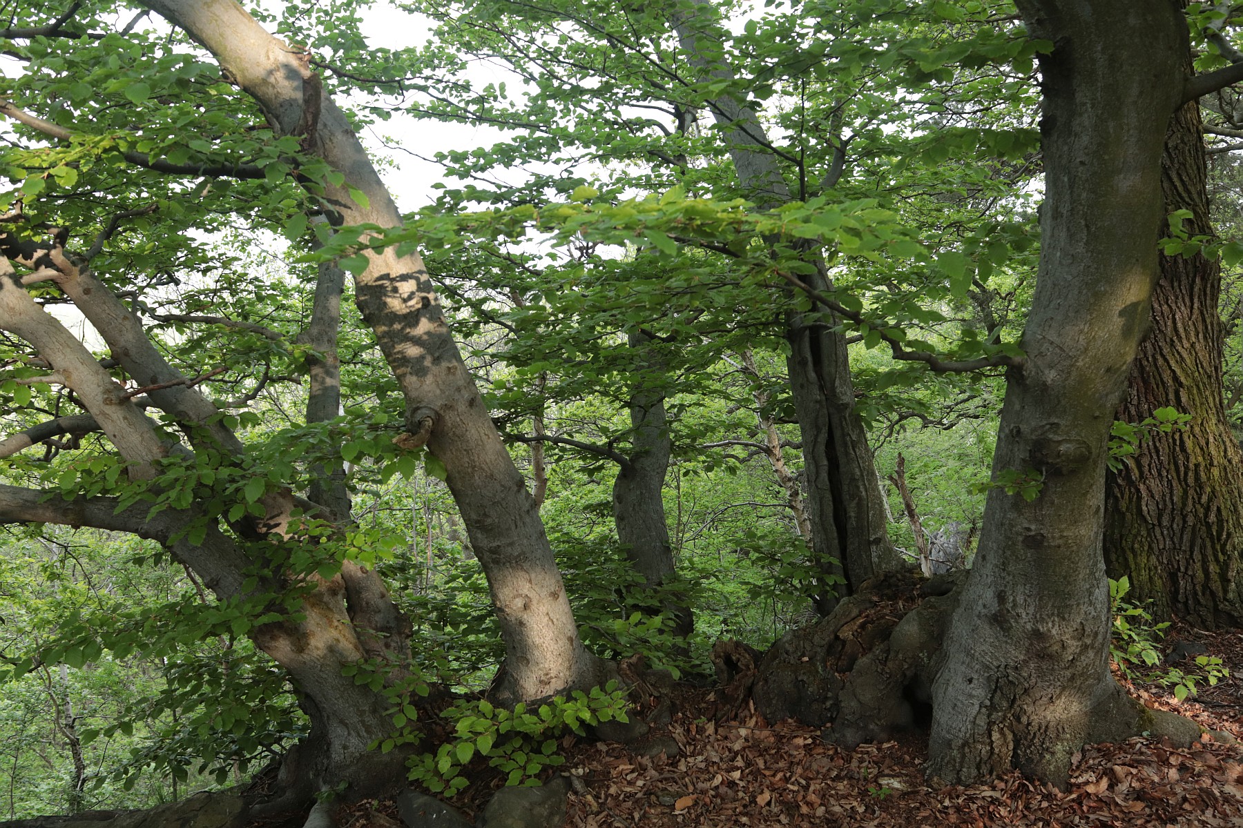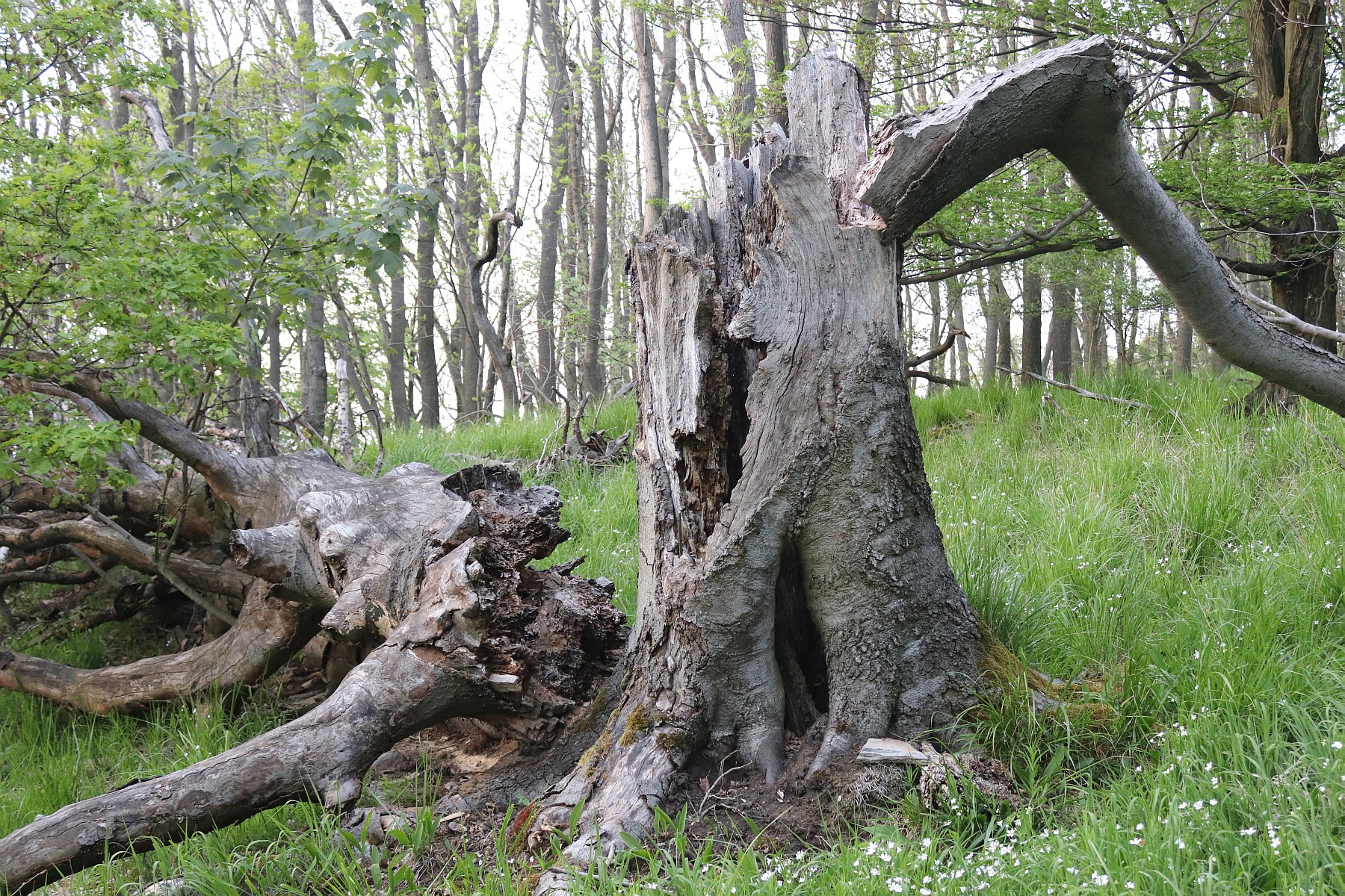 Vystoupili jsme pod trachytovými skalami na vrchol hory Zvon v Českém středohoří. Shazuju ze zad batoh a svlékám si propocené tričko. Na velké ploché kameny se dá posadit jak na lavičku. Skály tu občas připomínají na výšku zasunuté a divoce seříznuté zkamenělé folianty. Dominantou tu zůstává ohromné torzo buku rozlomeného vejpůl. Mohu jen litovat, že už uschnul. Ale i jinde se povalují odumřelé pokroucené větve připomínající plazy v křeči. Rýsují se na nich podivné protáhlé siločáry.