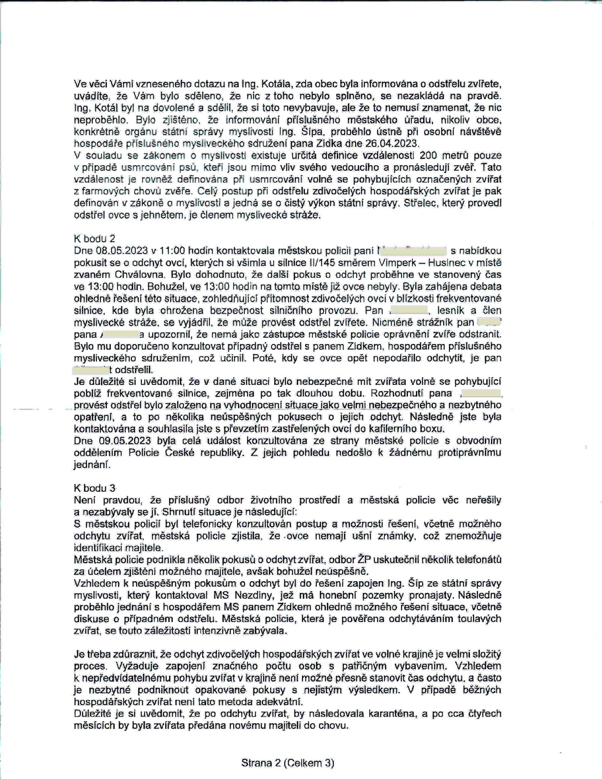 Mohu snad jen dodat, že vzhledem k vysvětlení paní starostky, kde uvádí, že ovce se pohybovali u odbočky na Pravětín, vzhledem k tomu, že ovce jezdila odchytávat Městská policie Vimperk a vzhledem k tomu, že ovce přivezla k likvidaci také Městská policie Vimperk, se nemám důvod domnívat, že se městská policie starala o ovce z jiného katastru. Navíc bez vědomí svého nadřízeného, zastupitele pověřeného vedením Městské policie Vimperk a paní starostky.