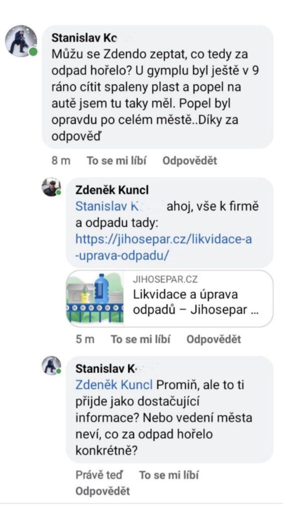 Nikdo po vedení města nechtěl šíření nějaké poplašné zprávy, ba právě naopak, občané chtěli slyšet, že sice hoří sklad odpadů, ale že od ranních hodin situaci monitoruje Česká inspekce životního prostředí, a že v ovzduší nejsou žádné zdraví nebezpečné látky.
