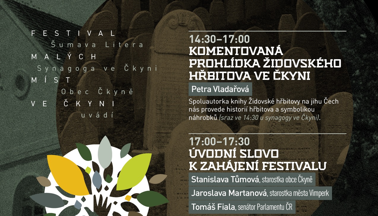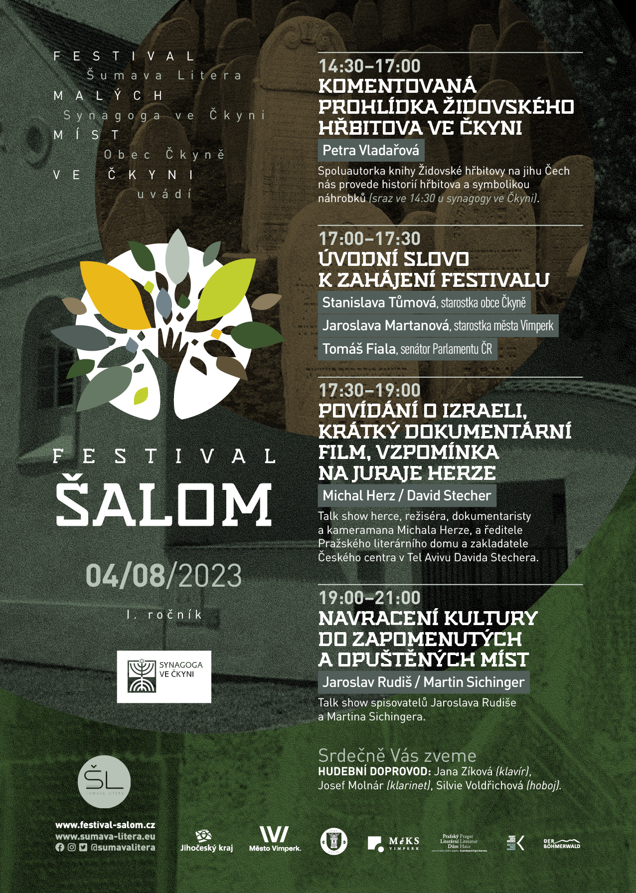 Festival Šalom v rámci cyklu Šumava Litera je přehlídkou židovské kultury, ale jeho neméně důležitým posláním je příležitost ke vzájemnému setkávání a porozumění. Festival Šalom s podtitulem festival malých míst, se bude konat každoročně vždy první srpnový pátek ve čkyňské synagoze s mottem „i malé může být velké“.