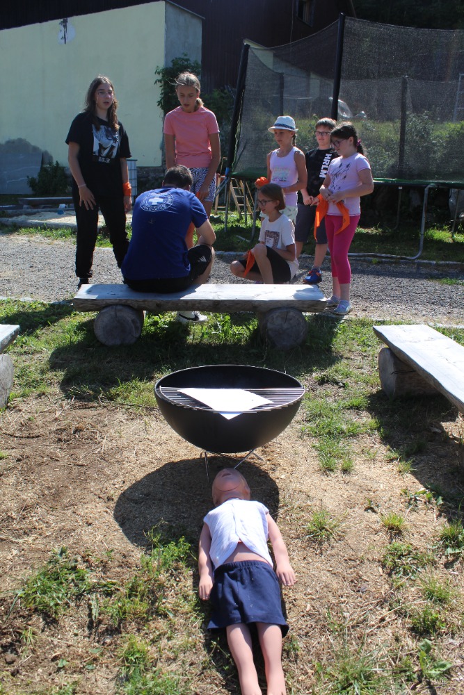 Během pobytu jsme se intenzivně věnovali první pomoci, děti absolvovaly řadu modelových situací v rolích figurantů i záchranářů. Neminulo je skutečné volání Horské služby – během výšlapu jsme totiž v lese našli zraněného turistu, o kterého se mladí zdravotníci postarali. Ve skutečnosti šlo o záchranáře z Horské služby, takže vyhodnocení a zejména pochvala z úst profesionála opravdu potěšila. Nejen děti.