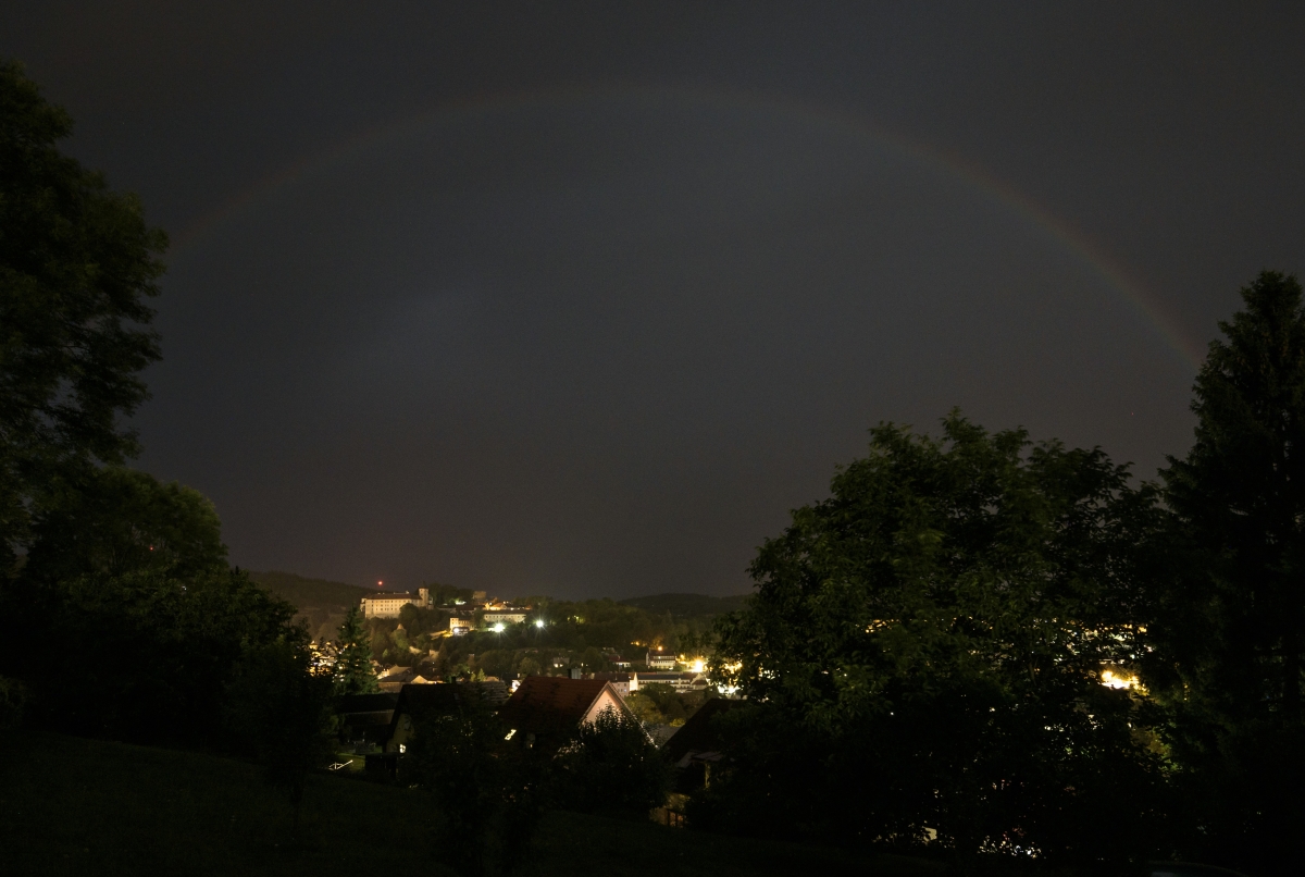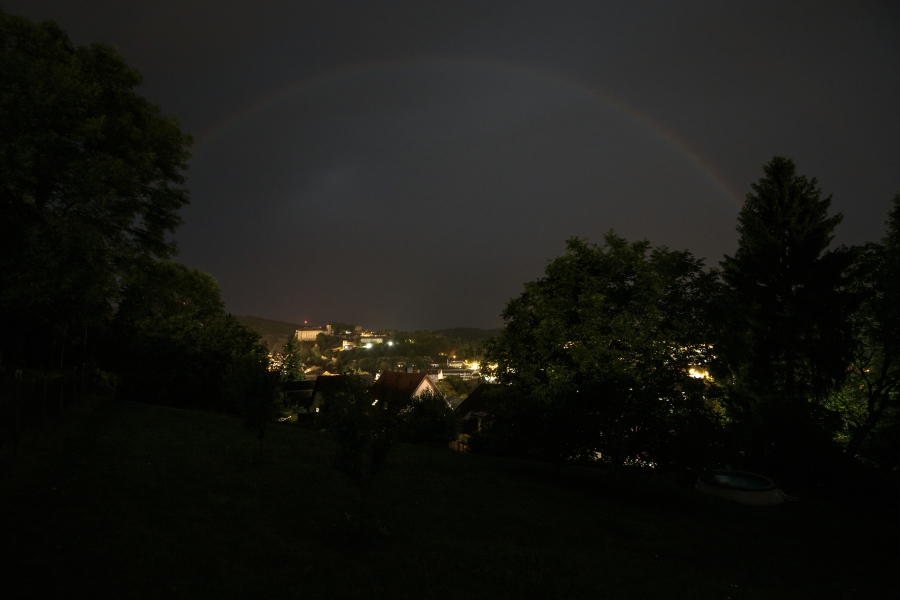 První ze dvou superúplňků, úžasně rámujících prvního a posledního dne letošní srpen, se však coby již mírně ubývající postaral v nočních hodinách 2. srpna o jednu z mnohem vzácnějších variant, tzv měsíční duhu. Po svém východu se musel, podobně jako předchozího dne, potýkat s pásem poměrně bohaté oblačnosti, nad který se úspěšně vyhoupl okolo půl jedenácté. A protože v těch okamžicích současně panovaly příznivé podmínky v podobě drobného deště na západní straně, zjevil se nad vimperským zámkem tento překvapivý kouzelný obraz: