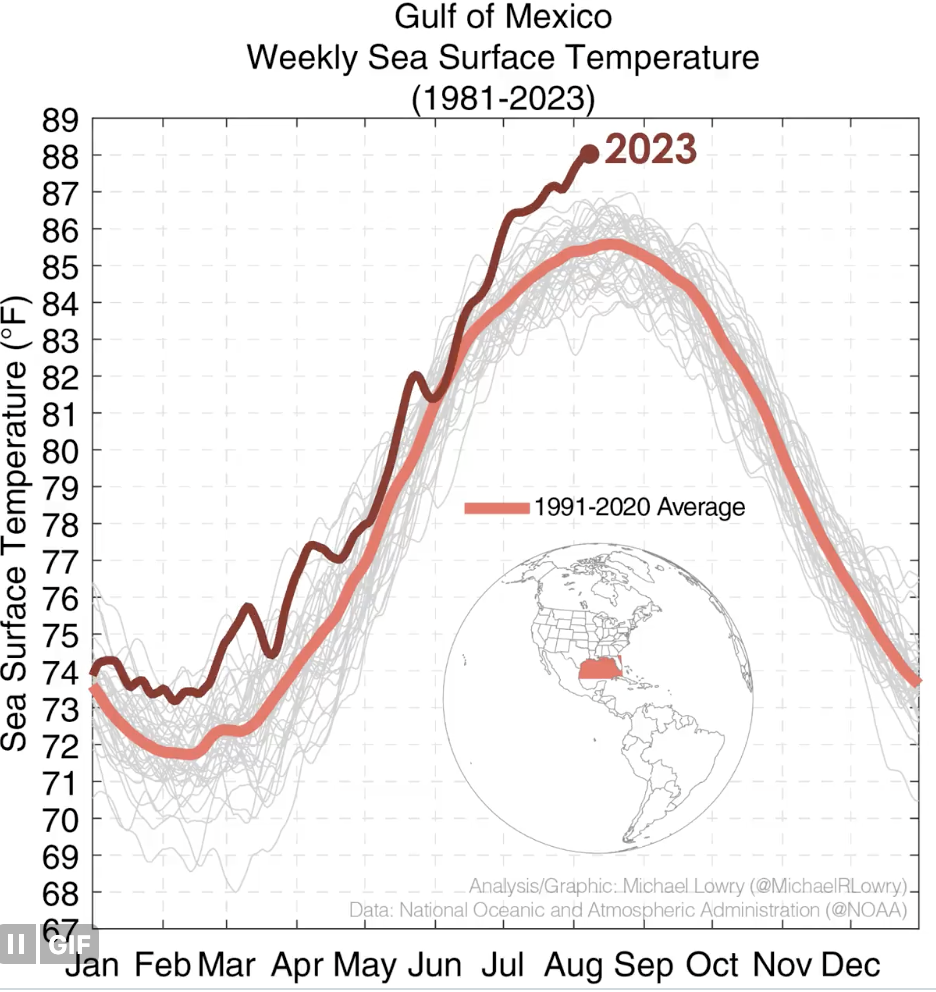 Mexický záliv je tento týden s velkým náskokem vůbec nejteplejší za celý rok v historii. Týdenní průměrné teploty hladiny moře v Perském zálivu nikdy nepřekročily 87°F, ale tento týden překročily 88°F, což je neuvěřitelných 1,4°C (2,6°F) nad průměrem let 1991-2020.
