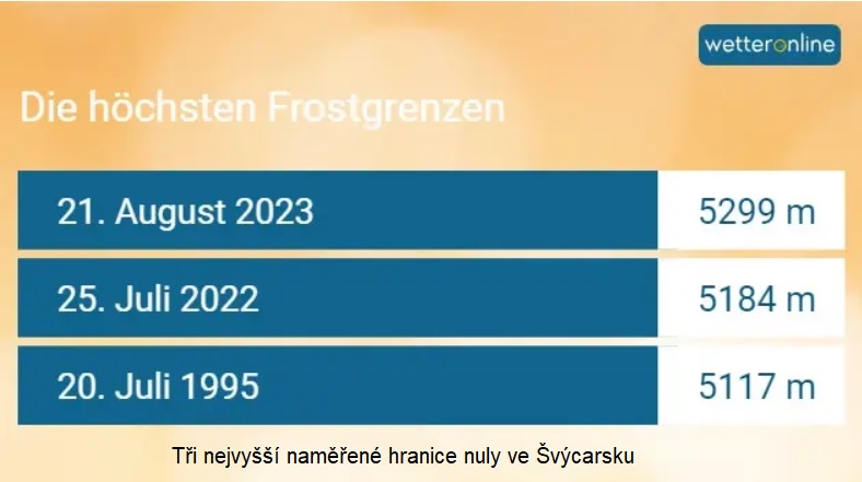 V noci na pondělí (21.08.2023) byl stanoven nový rekord na nulové hranici. Nad západní švýcarskou střední zemí panovala nulová teplota až v nadmořské výšce 5299 metrů.