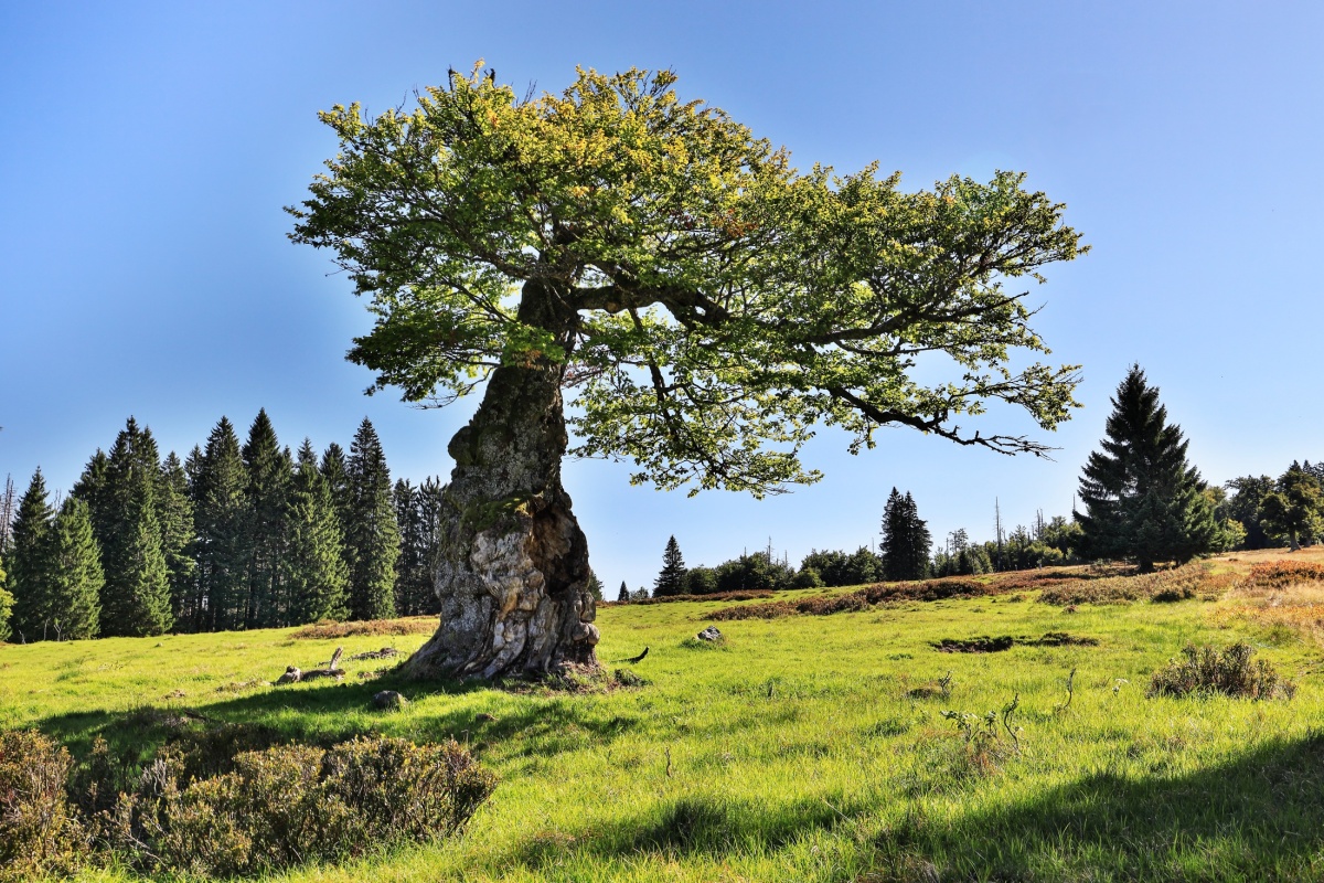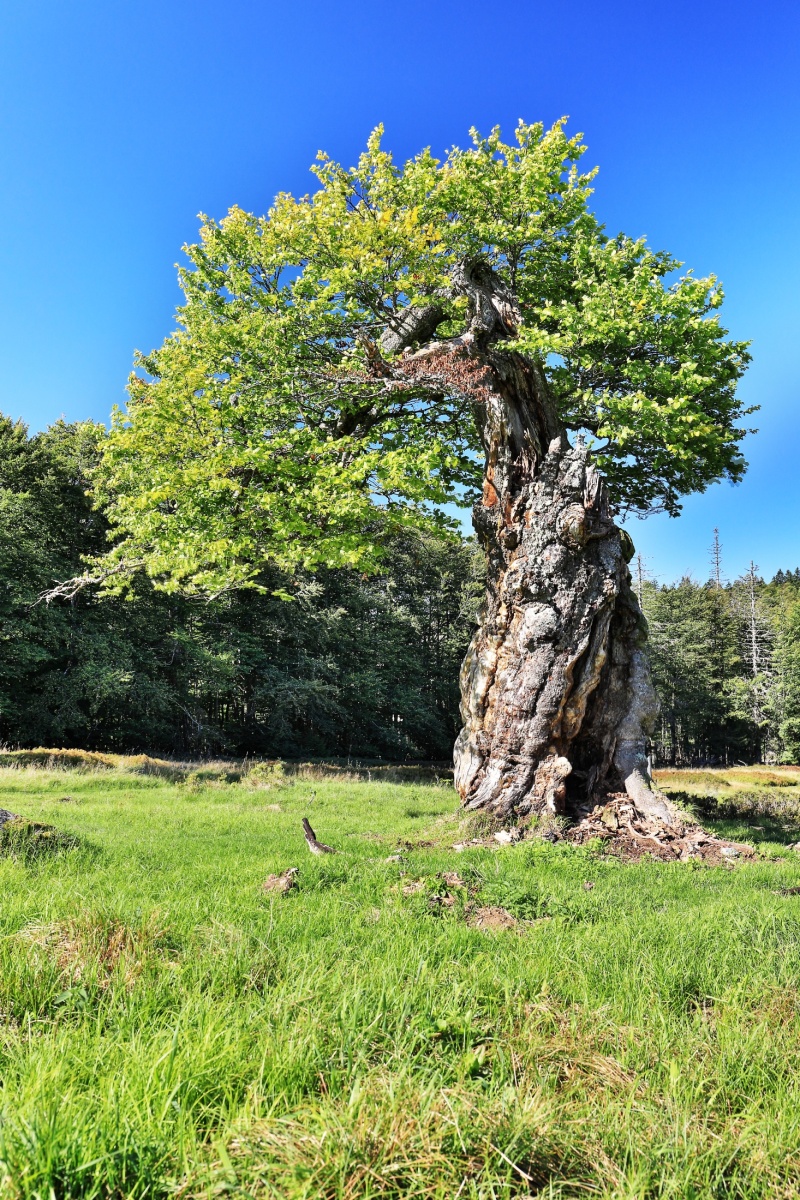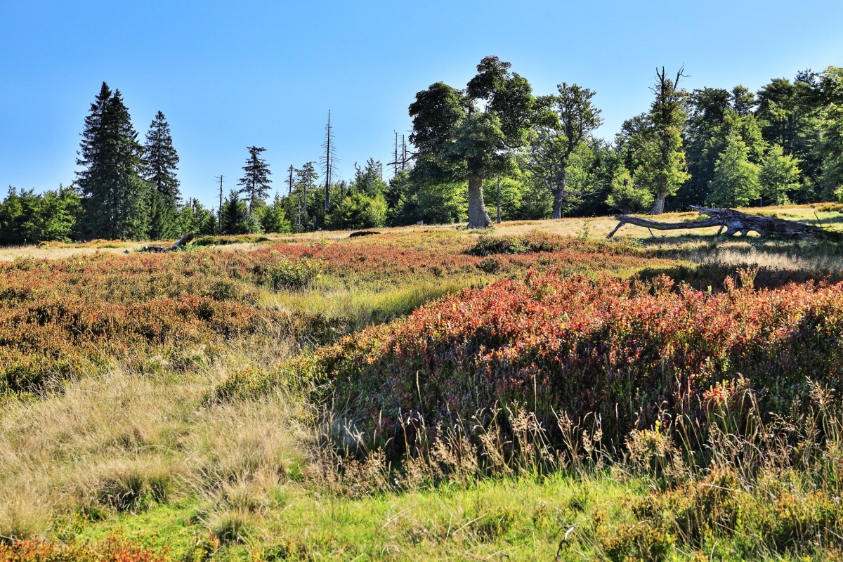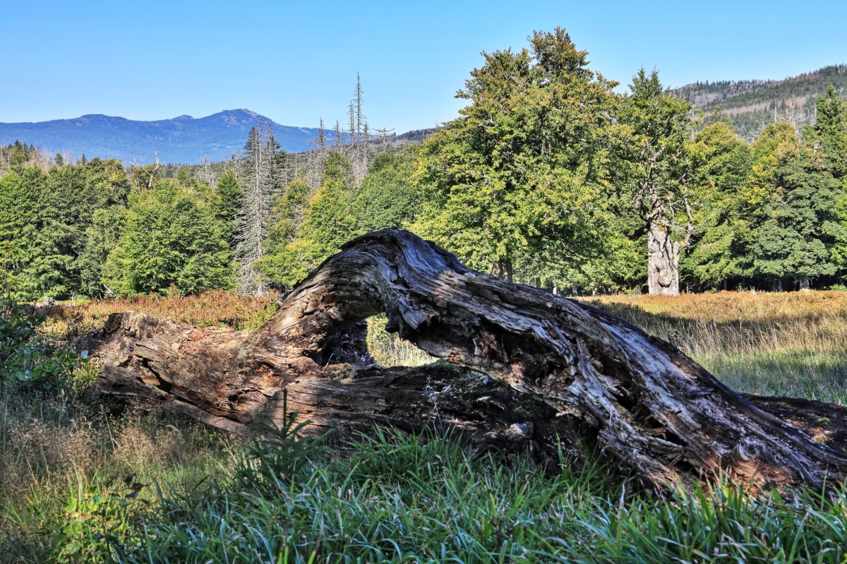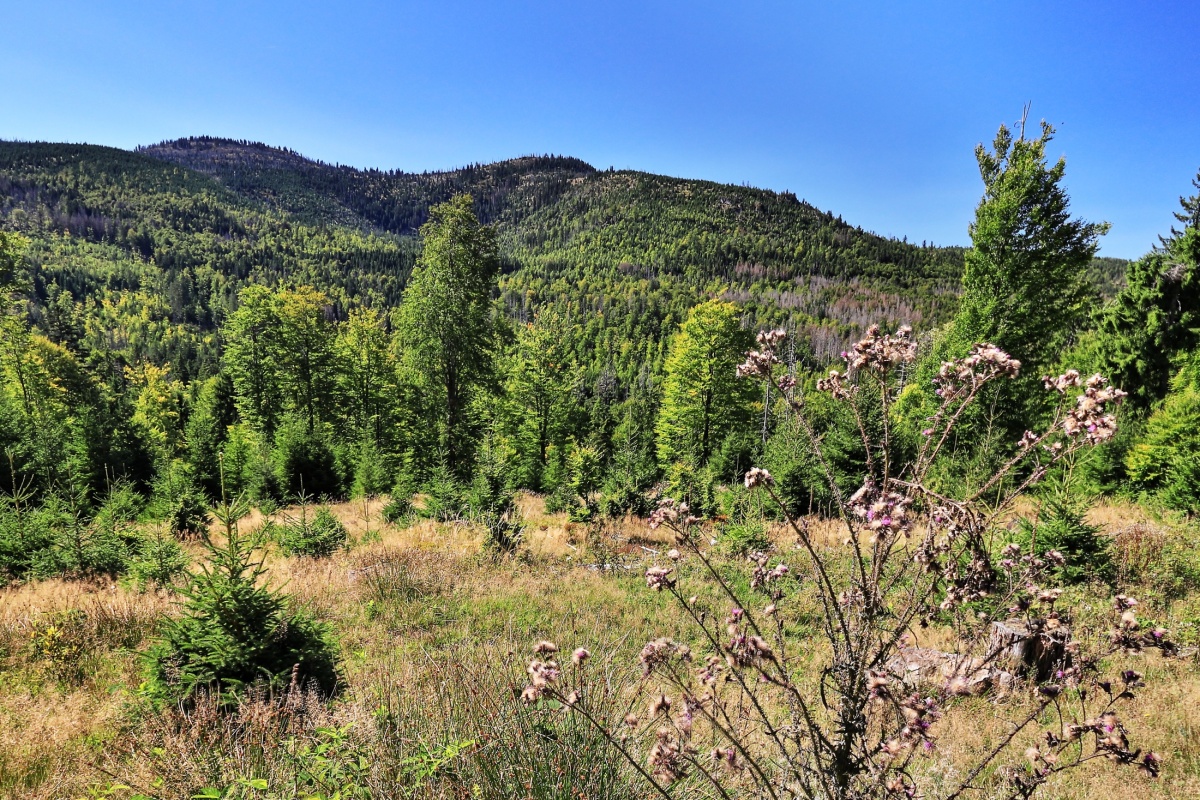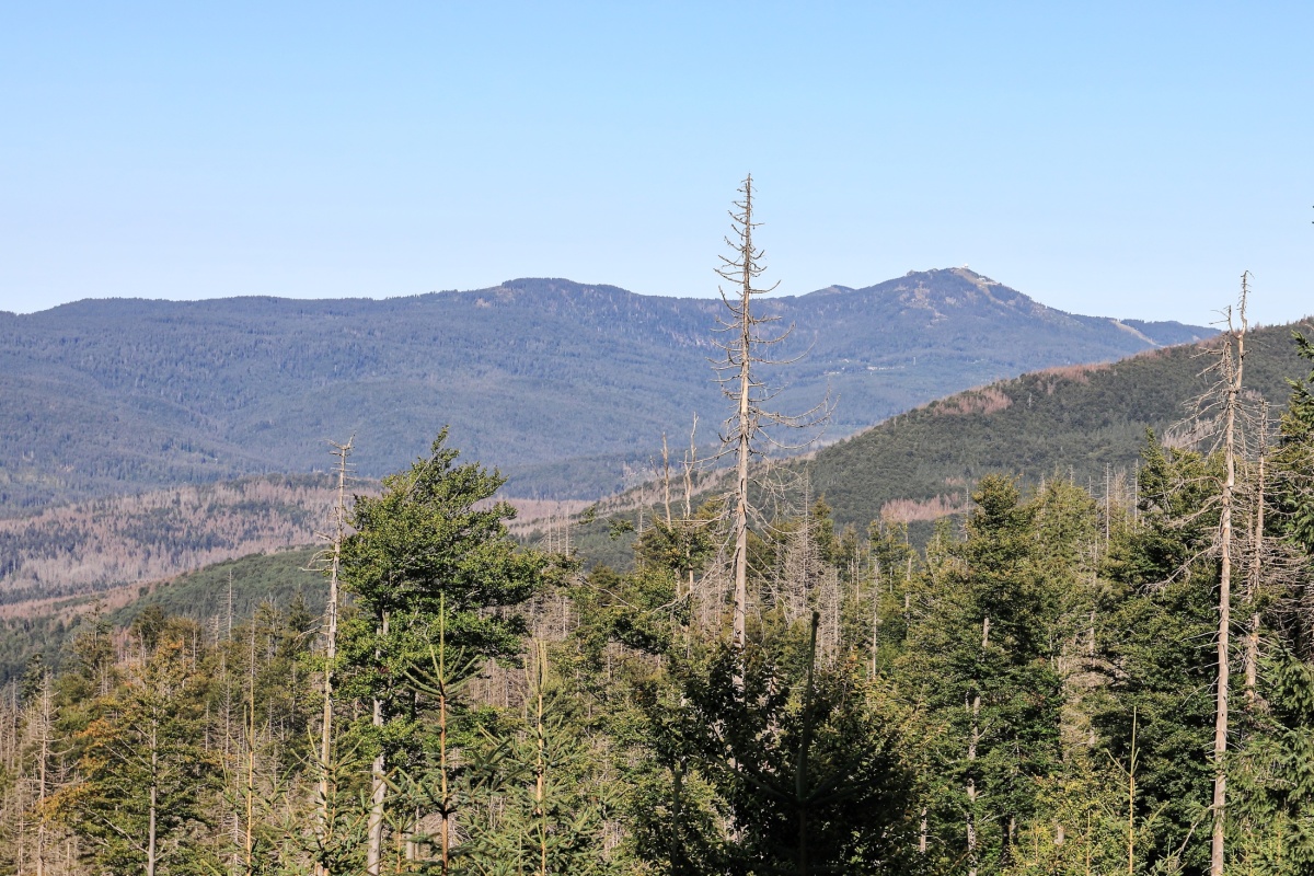 Počasí je stále pěkné, bez srážek ale také bohužel bez mraků. Modrou oblohu moc rád nemám, ale i tak jsme si zase vyjeli na kolech do Bavorského lesa. Vše po oficiálních cyklostezkách a na několika místech kousek pěšky do jednotlivých lokalit za fotografováním. Trasa vedla z Prášil přes Gsenget pod Jährlingschachten s výhledem na Poledník a až na Alpy, dále pod Kiesruckem k Hochschachten s výhledy na Javor i Roklan, dolů k vodní nádrži Frauenau a přes Buchenau nahoru zpět přes Gsenget do Prášil. Je to celkem asi 42 km, takže pohoda.