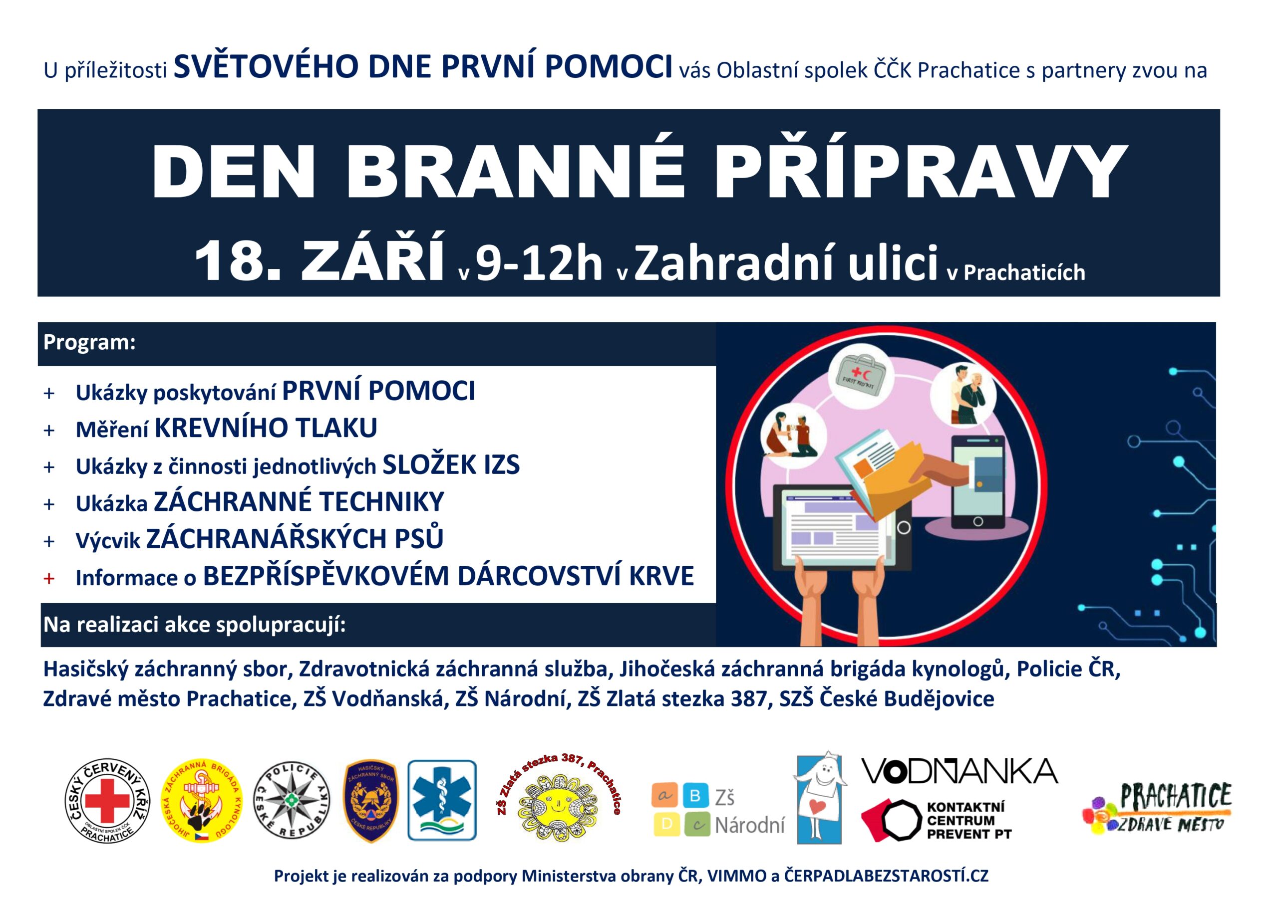 Na druhou sobotu v září připadá Světový den první pomoci. Oblastní spolek Českého červeného kříže Prachatice spolu s partnery u této příležitosti přichystal mnoho zajímavého – 18. září od 9 do 12 hodin tak bude v Zahradní ulici možné vyzkoušet si ošetření různých poranění, nechat si změřit tlak nebo zhlédnout ukázku práce Jihočeské záchranné kynologické brigády.