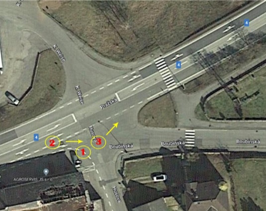 Já jsem přijížděl z centra po ulici Pražská a odbočoval jsem do ulice Boubínská, na mapce bod č. 2, a řidič bílé dodávky sjížděl z ulice Husova a odbočoval do ulice Pražská směr Strakonice, označeno pod bodem č. 3. Jelikož přes zaparkovanou dodávku neviděl do křižovatky, tak vjel do křižovatky tak, aby mohl dát přednost autům, které přijíždějí od Strážného. Jen díky místní znalosti a nízké rychlosti se mi podařilo odvrátit střet s dodávkou. Přestože řidič dodávky neudělal nic špatně, tak by byl označen jako viník dopravní nehody se všemi následky.