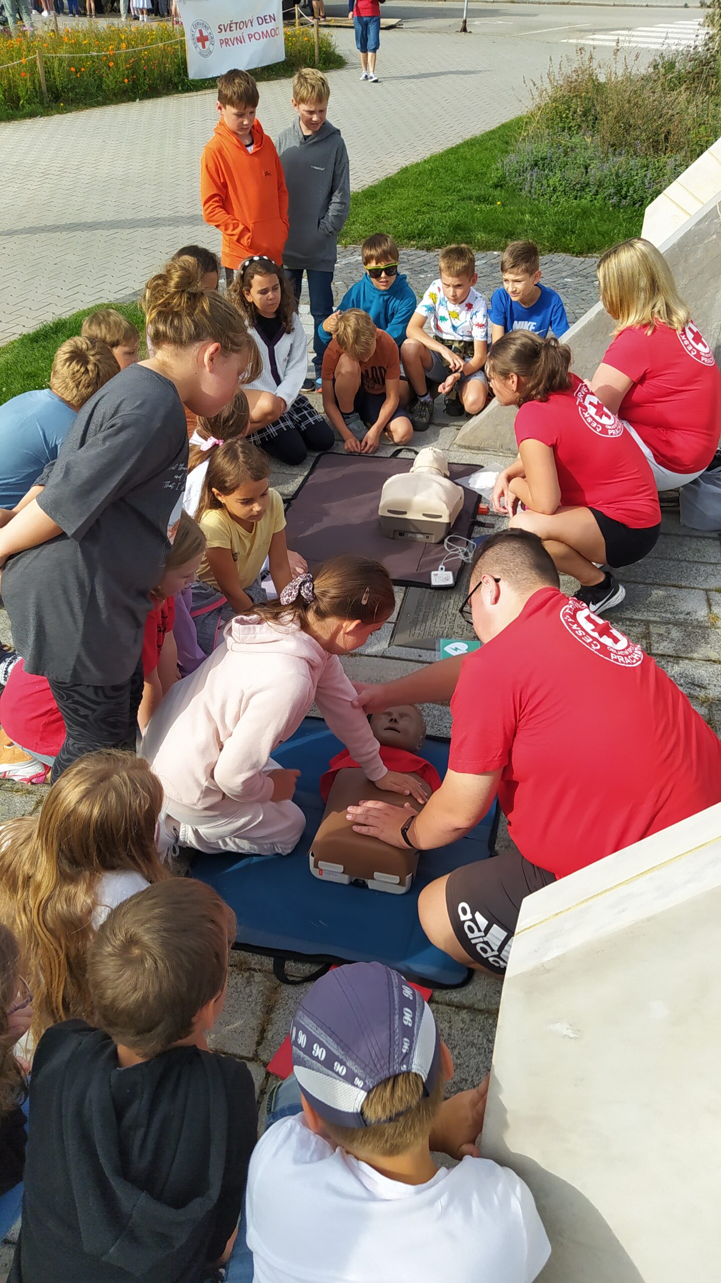 Dobrovolníci ČČK, mezi nimi i studenti SZŠ České Budějovice, žáci prachatických ZŠ Vodňanská, Národní a Zlatá stezka 240, vimperských ZŠ Smetanova, Vimperk, ZŠ Šumavské Hoštice a ZŠ Stachy Vacov seznámili příchozí s  postupy první pomoci u zástavy a s využitím automatického externího defibrilátoru při resuscitaci, s ošetřením krvácejících poranění, poranění oka, popálenin, odřenin, masivního krvácení, panické ataky nebo řezných ran.