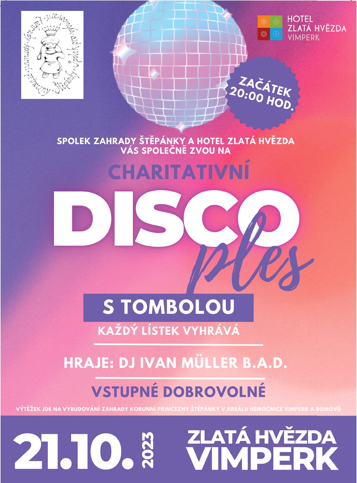 zveme Vás na CHARITATIVNÍ DISCO PLES PLNÝ OSLAV, který dne 21.10.2023 pořádá hotel Zlatá hvězda a Spolek korunní princezny Štěpánky. Výtěžek z dobrovolného vstupného a tomboly půjde na další budování okrasné a odpočinkové zahrady v prostorách BH Nemocnice ve Vimperku. Díky vimperským podnikatelům, kteří darovali zajímavé ceny každý zakoupený lístek v tombole bude výherní. A jelikož na tomto disco plese oslaví Dj Ivan Müller výročí, kdy odehraje diskotéku s pořadovým číslem 1900, můžeme se všichni těšit na opravdu dobrou zábavu.