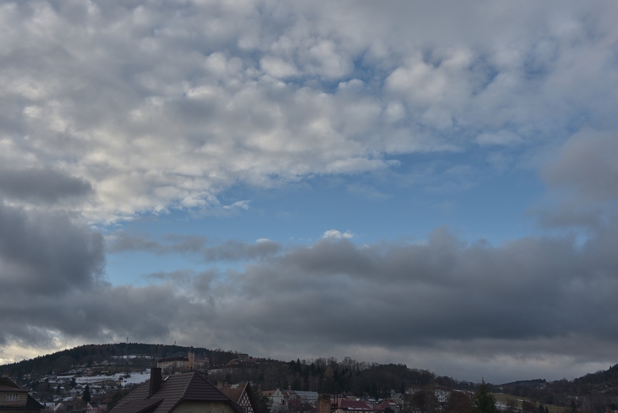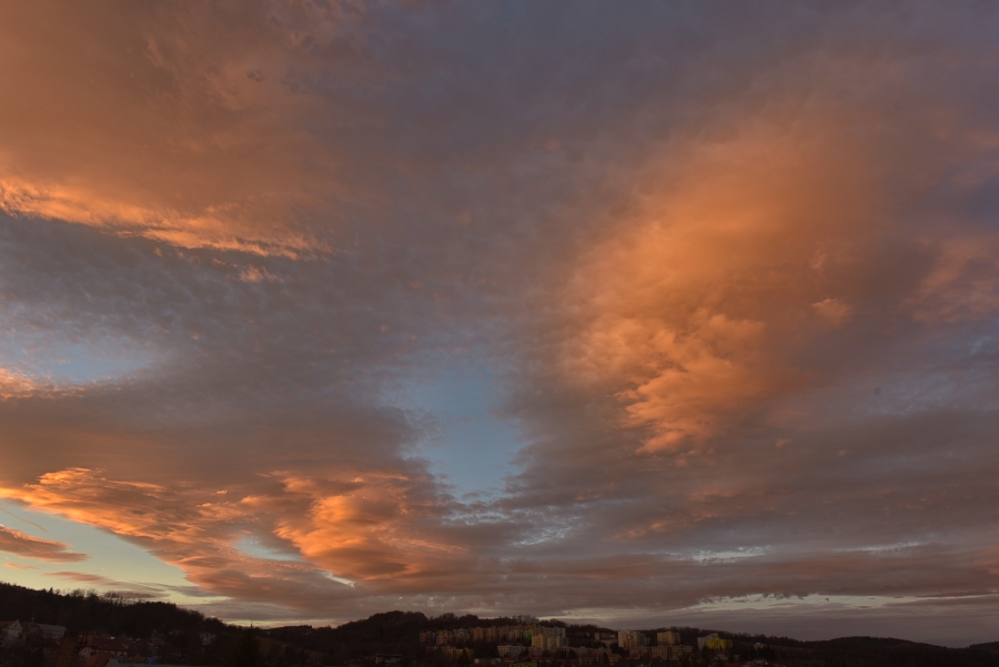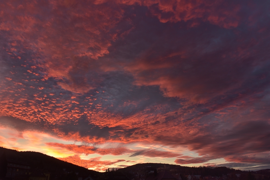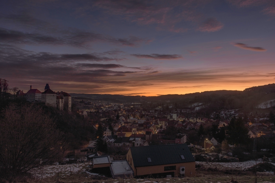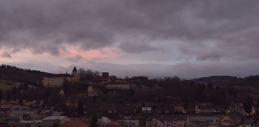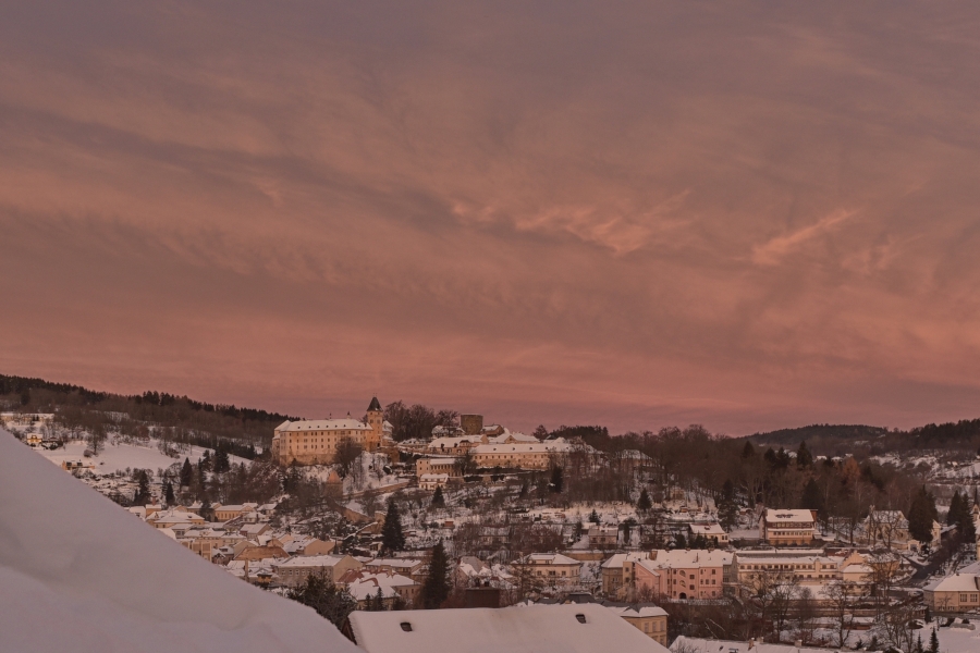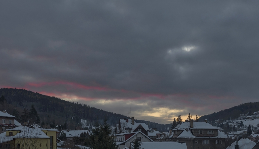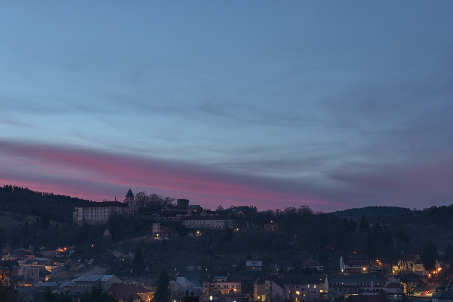 Vimperku a všem níže položeným lokalitám sice zůstala i tentokrát v čase vánočním zimní poezie odepřenou, ale aspoň sváteční večerní obloha se snažila barevně kouzlit.