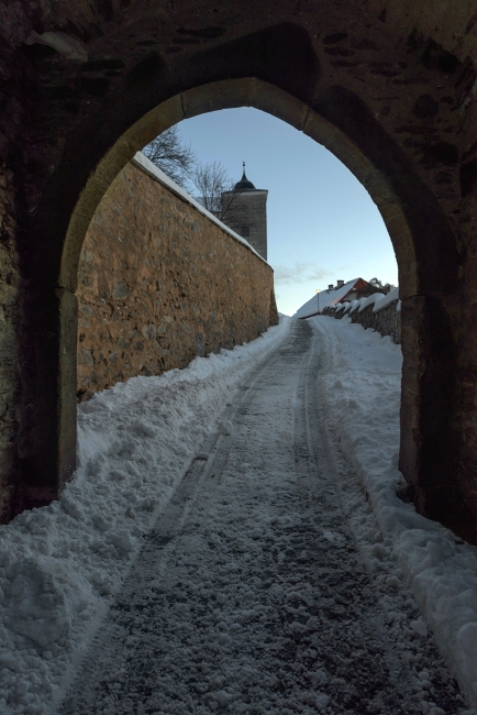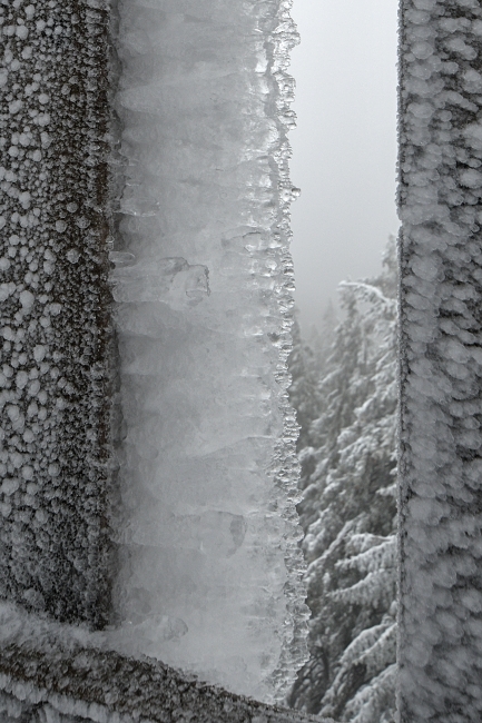 … neboť jediný nepozorný krok na nebezpečně zledovatělém povrchu by mohl snadno vyústit v krajně nepříjemný zážitek. Ostatně pro celou poměrně kluzkou cestu vzhůru lze momentálně jedině doporučit vylepšení obuvi nesmeky.